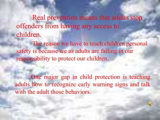 Real prevention of child abuse means stopping offenders from having any access to children. Adults are failing to protect children, as shown by the need to teach children personal safety skills. One gap is teaching adults to recognize early warning signs and have difficult conversations with adults showing concerning behaviors.