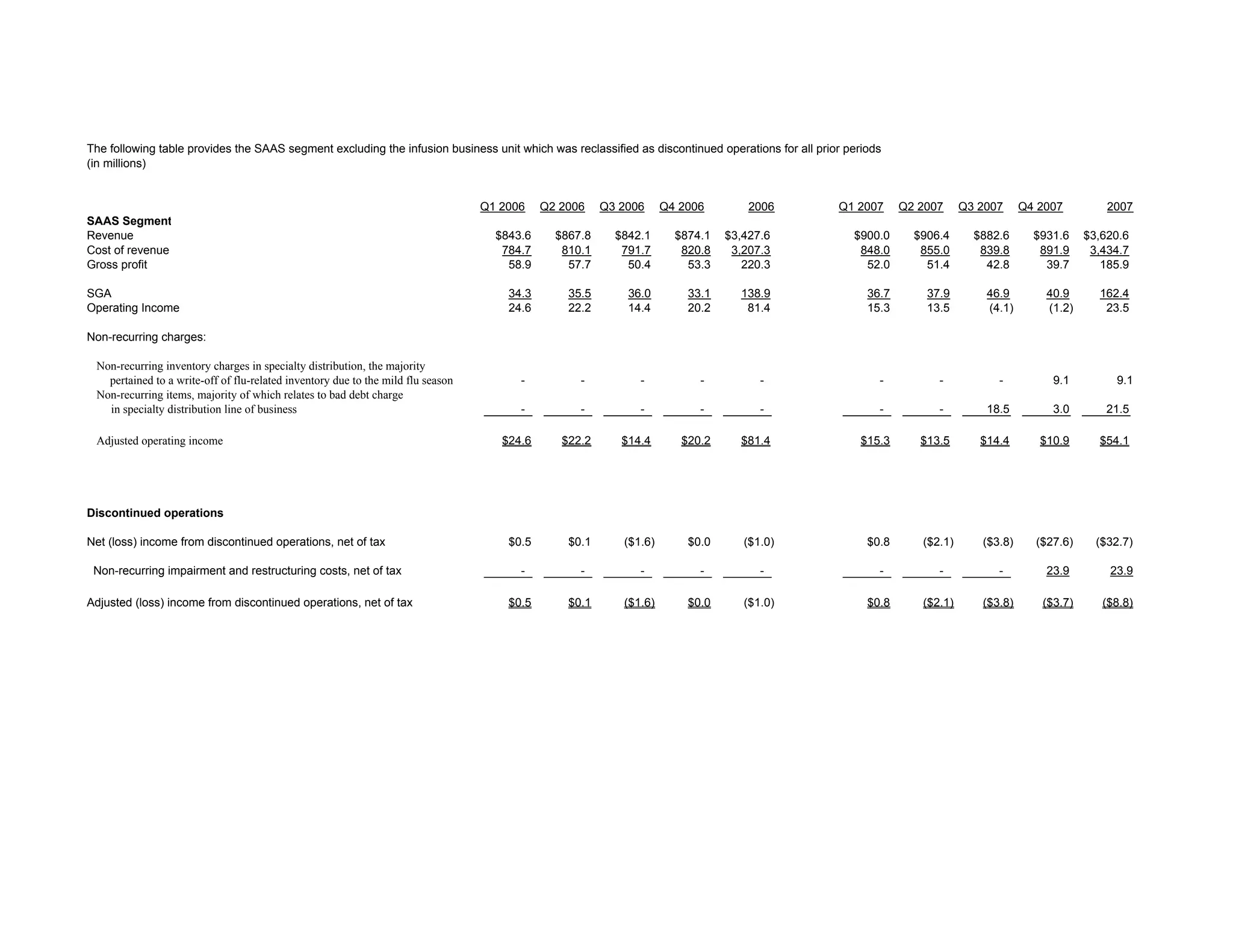 This document provides quarterly and annual revenue, cost, operating income, and other financial data for the SAAS segment of a company from 2006 to 2007. It shows that the segment grew its revenue each year but saw declining operating income in 2007 due to non-recurring inventory write-offs, bad debt charges, and impairment costs associated with discontinued operations. The data is presented to provide an adjusted view of the segment's performance that excludes these one-time items.