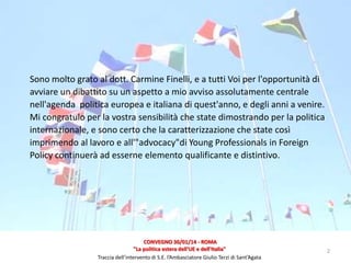 L'ambasciatore Giulio Terzi di Sant'Agata discute l'importanza della politica estera europea e italiana, evidenziando la necessità di un maggior impegno politico sull'argomento. Sottolinea la lentezza con cui si stanno formando politiche estere efficaci e la mancanza di coesione tra gli Stati membri dell'UE. Propone un approccio che integri una politica estera comune, insieme a una strategia di difesa e sicurezza, per affrontare le attuali sfide globali.