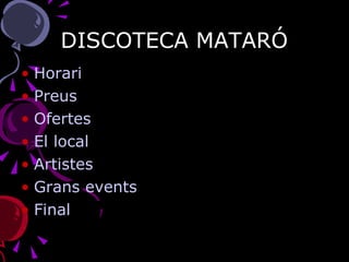 Discotecamataro 1. 2. 3. Horaris Disco Light : dissabtes i diumenges de 18:00 a 23:00 Disco + 18:dissabtes i diumenges de 23:00 fins a les 6:00 4. 5. Ofertes Grups + de 10 pers.: Descompte del 20% 2 euros de descompte si vas per llista 6. 7. 8. 9. 10. 11. 12. Grans events Gran festa de disfresses 13 de Març Concurs de ball 27 de Març El dia del regals 3 d’Abril Festa de l’espuma 10 de juliol Drinkin day (+18) 14 d’Agost Mister DISCOMATARÓ 4 septembre Miss DISCOMATARÓ 11 septembre I molts més events! 13.