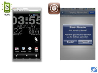 This document provides techniques for conducting low-cost, fast usability testing for mobile devices. It discusses common problems with mobile usability testing including issues related to the physical devices, capturing user behavior, and testing emotional engagement. The document then recommends incremental research methods using a variety of low-fidelity and higher-fidelity techniques at different stages. Specific techniques discussed include paper prototyping, emulator studies, early app builds, and diary studies. The document emphasizes the importance of involving the product team and addressing issues quickly through methods like RITE testing.