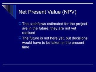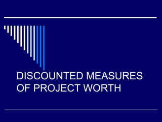 The document discusses several discounted measures used to evaluate project worth: net present value (NPV), net benefit investment ratio (NBIR), benefit-cost ratio (BCR), and internal rate of return (IRR). It provides the formulas and decision rules for each measure. It notes that while NPV, NBIR, BCR, and IRR are commonly used, IRR can be unreliable in situations with non-conventional cash flows or mutually exclusive projects, and that NPV should be used to resolve conflicts between decision rules.