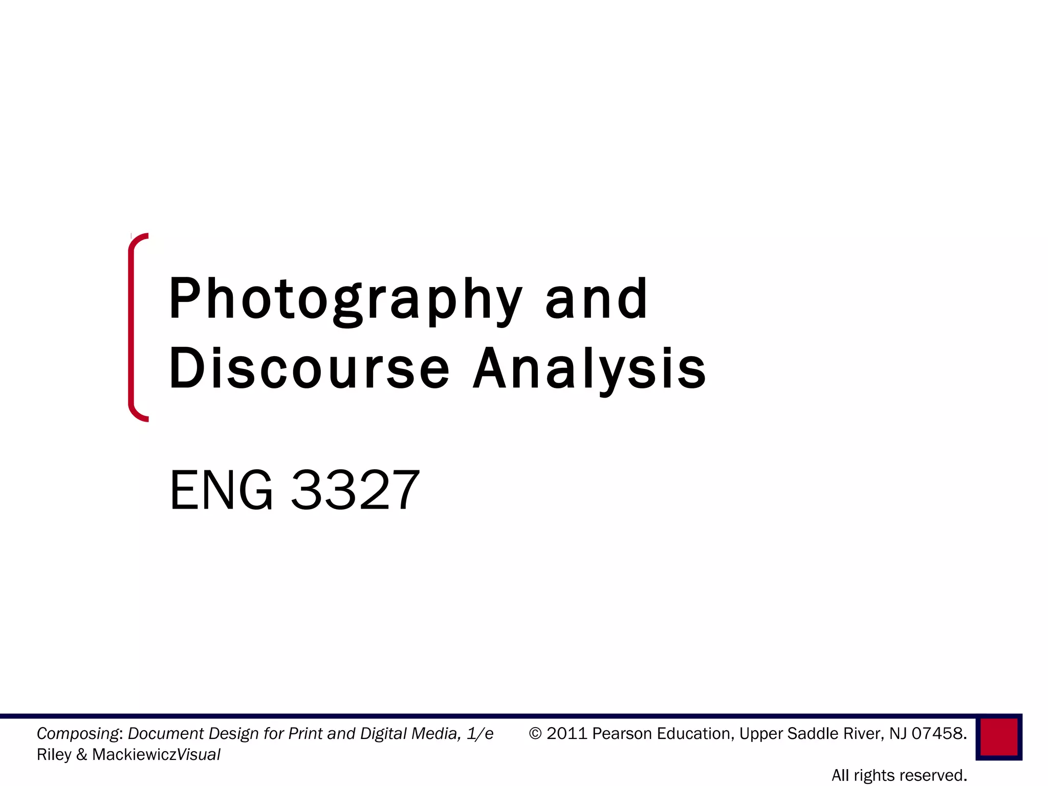 This document provides an overview of a chapter that discusses discourse analysis and visual methodologies. It defines key terms related to discourse analysis like discourse, discursive formation, and regimes of truth. It also outlines the main steps and similarities/differences between discourse analysis and semiotics. Considerations for writing a discourse analysis are presented, such as using detailed evidence and examining counter cases.