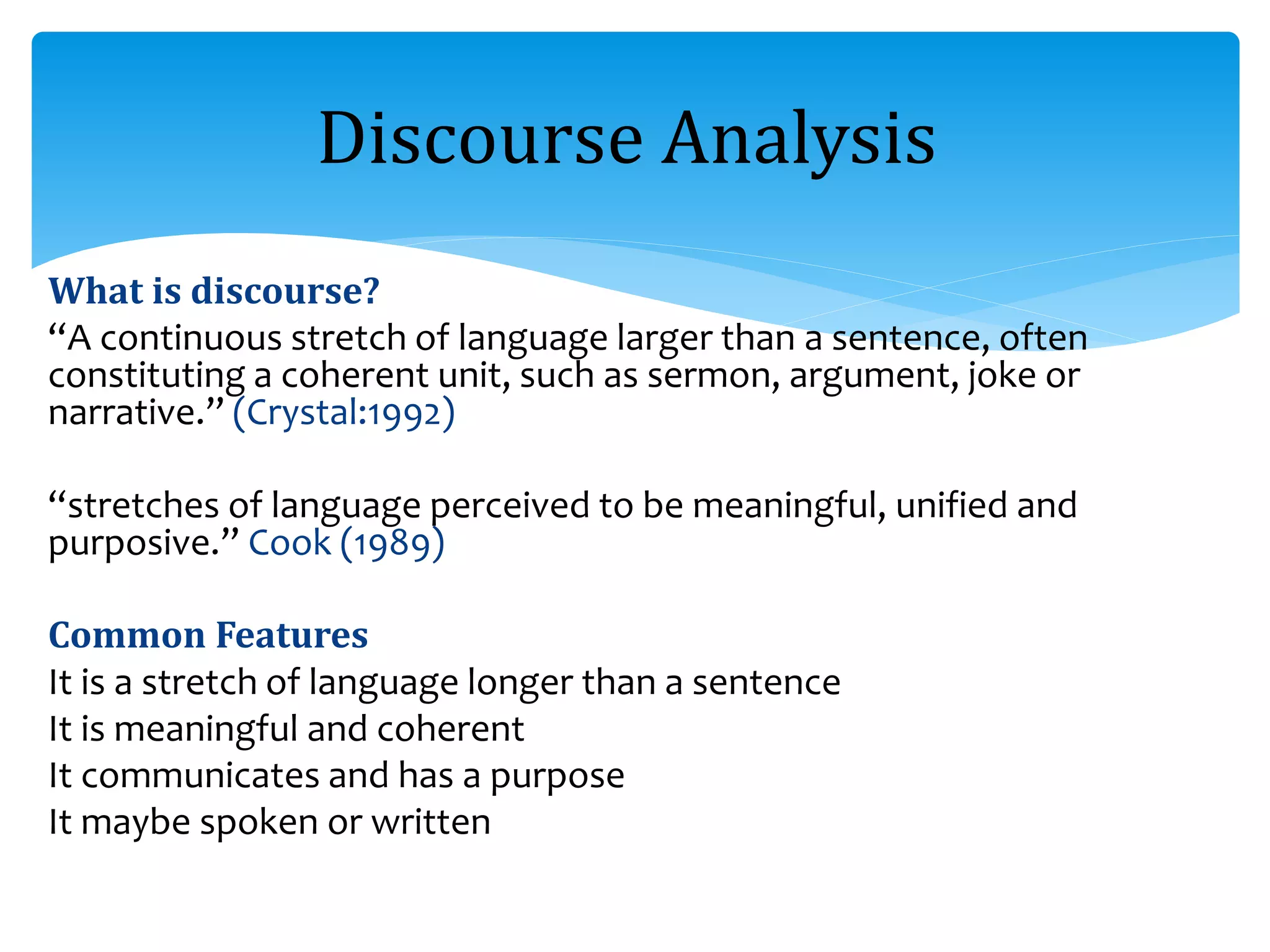 The document provides an introduction to discourse analysis. It defines discourse as language use beyond the sentence level, including features such as being meaningful, coherent, and purposive. Discourse analysis examines language in use and how context contributes to meaning. Speech act theory and Grice's cooperative principle are discussed as are key concepts like adjacency pairs in conversation analysis. The document offers examples throughout to illustrate discourse analysis concepts and techniques.