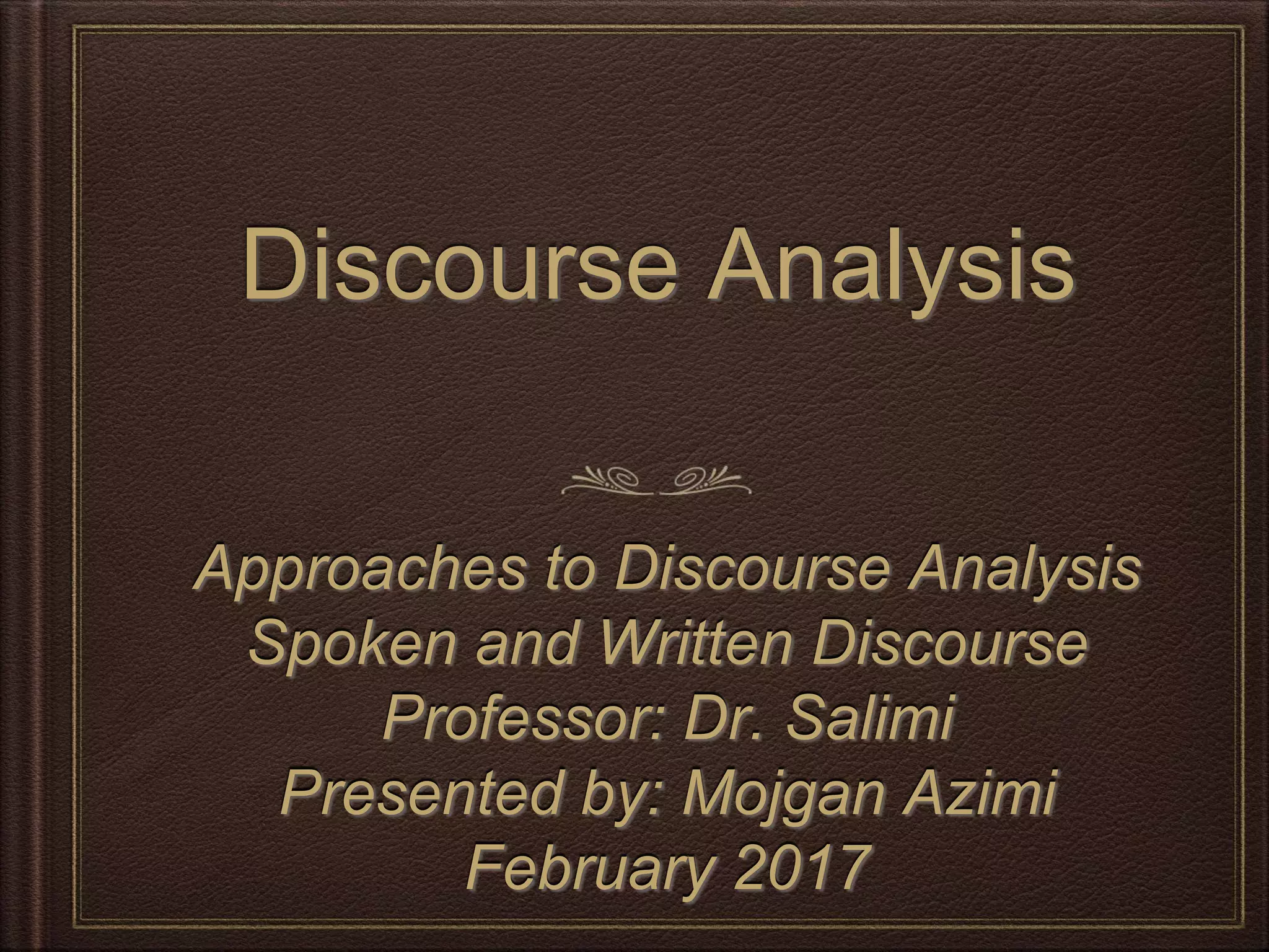 Discourse analysis involves analyzing language in its social context. It analyzes real texts, not artificial ones, and looks at utterances rather than isolated sentences. There are several approaches to discourse analysis, including sociology, ethnography, variation theory, and systemic functional linguistics. Spoken and written discourse differ in aspects like lexical density, grammar use, and repetition of words. Corpus linguistics uses large text databases to quantitatively and qualitatively analyze patterns of language use and variation in discourse. Discourse analysis can inform language pedagogy by helping teachers delineate genres, explain text features, evaluate student performance, and teach discourse structures.