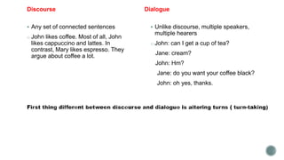 2) There are two types of discourse: reciprocal, which allows for interaction/feedback, and non-reciprocal, such as a book. Most discourse involves some level of reciprocity.