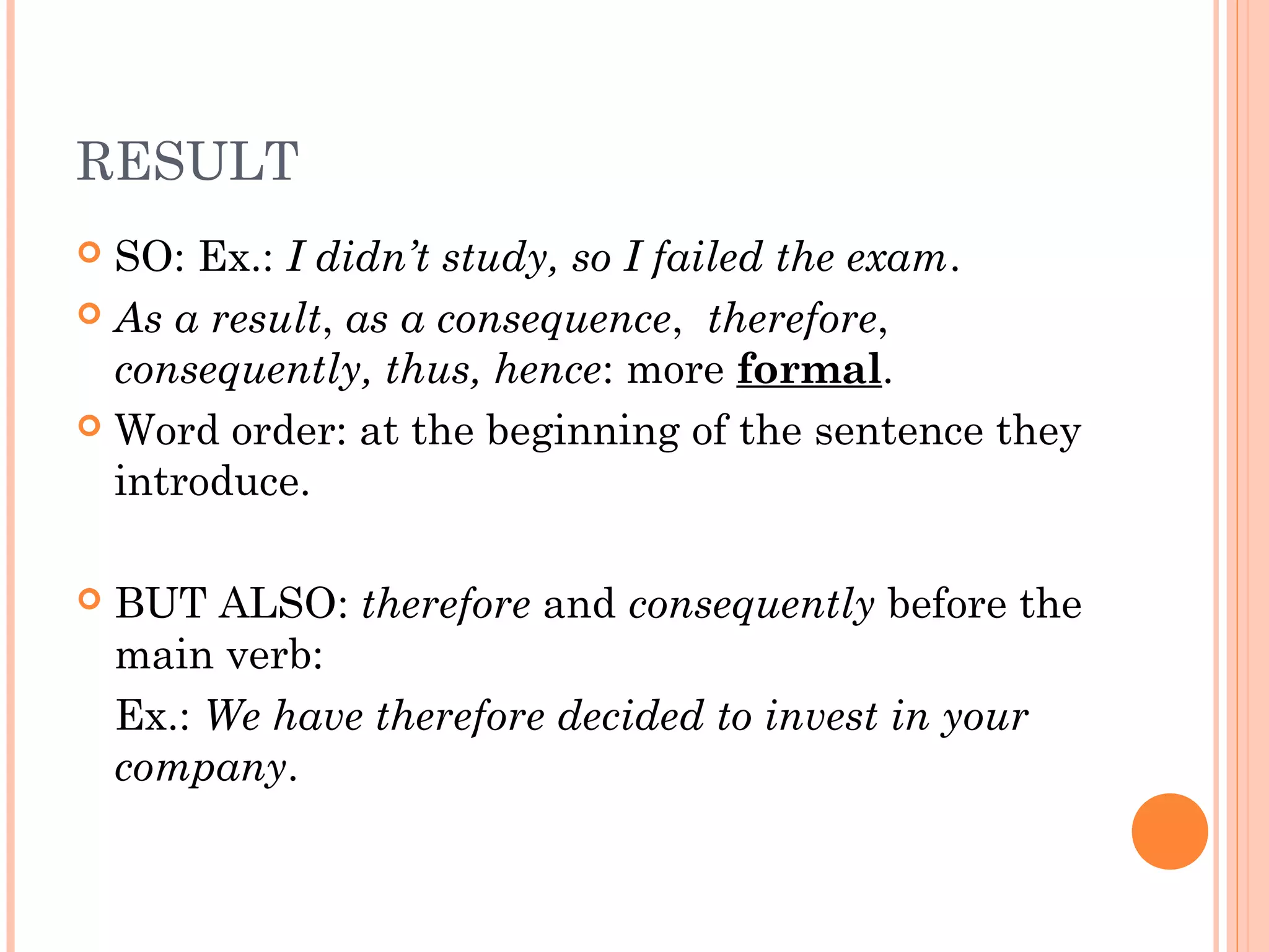 This document discusses different discourse markers used to indicate result, reason, purpose, and contrast. It provides examples of how each marker is used to introduce clauses and sentences. For result, it discusses markers like "so" and "as a result". For reason, it covers markers like "because", "since", and "owing to". For purpose, it lists "to", "in order to", and "so as to". For contrast, it examines contrastive markers like "but", "however", "although", and "despite".