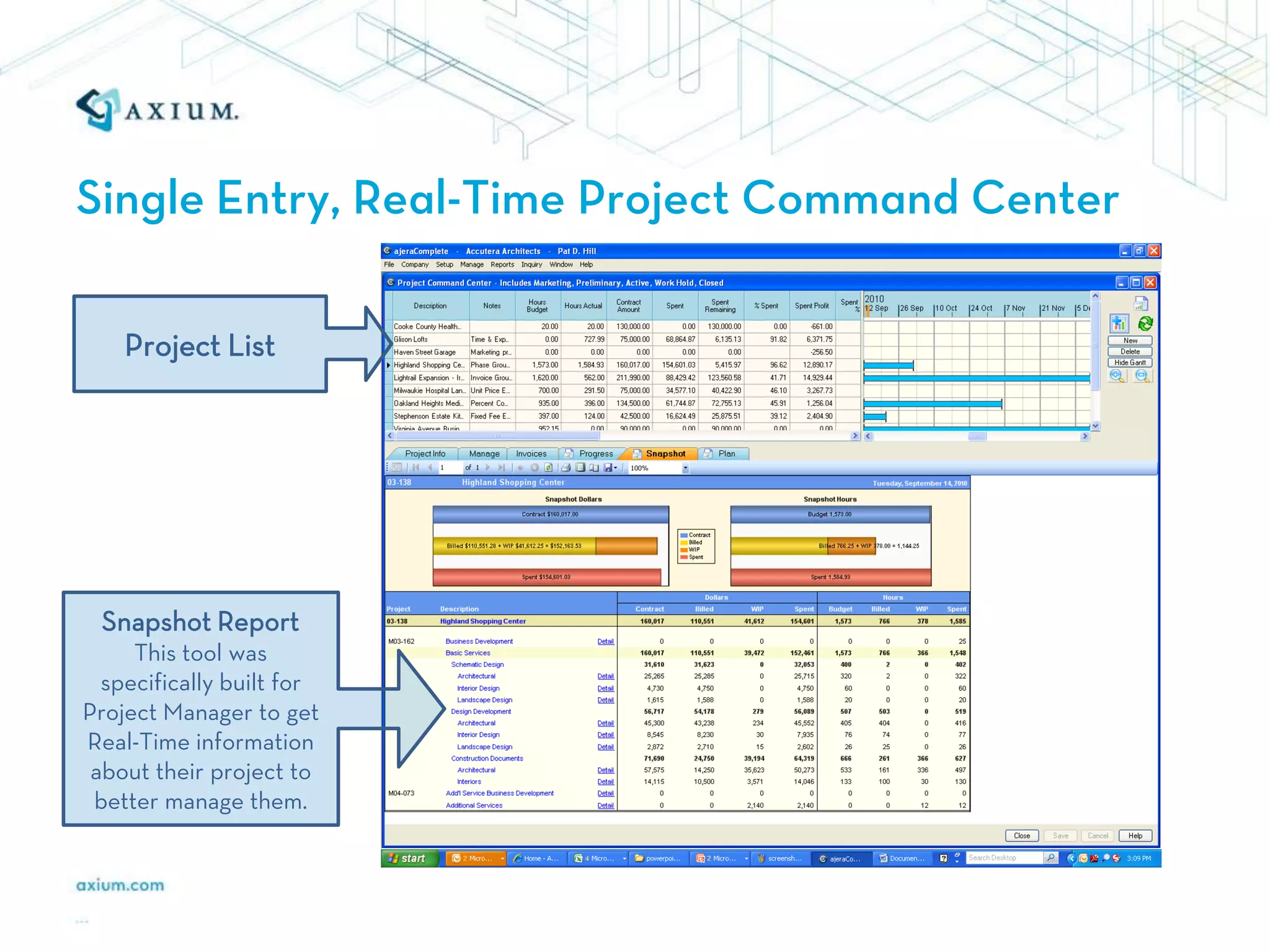 The document describes the key features of ajeraComplete's Project Command Center tool. It allows project managers to see contract amounts, work in progress, billed amounts, and expenses spent in real-time. Project managers can view hours and expenses allocated to their projects along with any attached notes. The software makes it easy to create, customize, and manage projects, tasks, resources, timesheets, invoices, and cash flow forecasts.