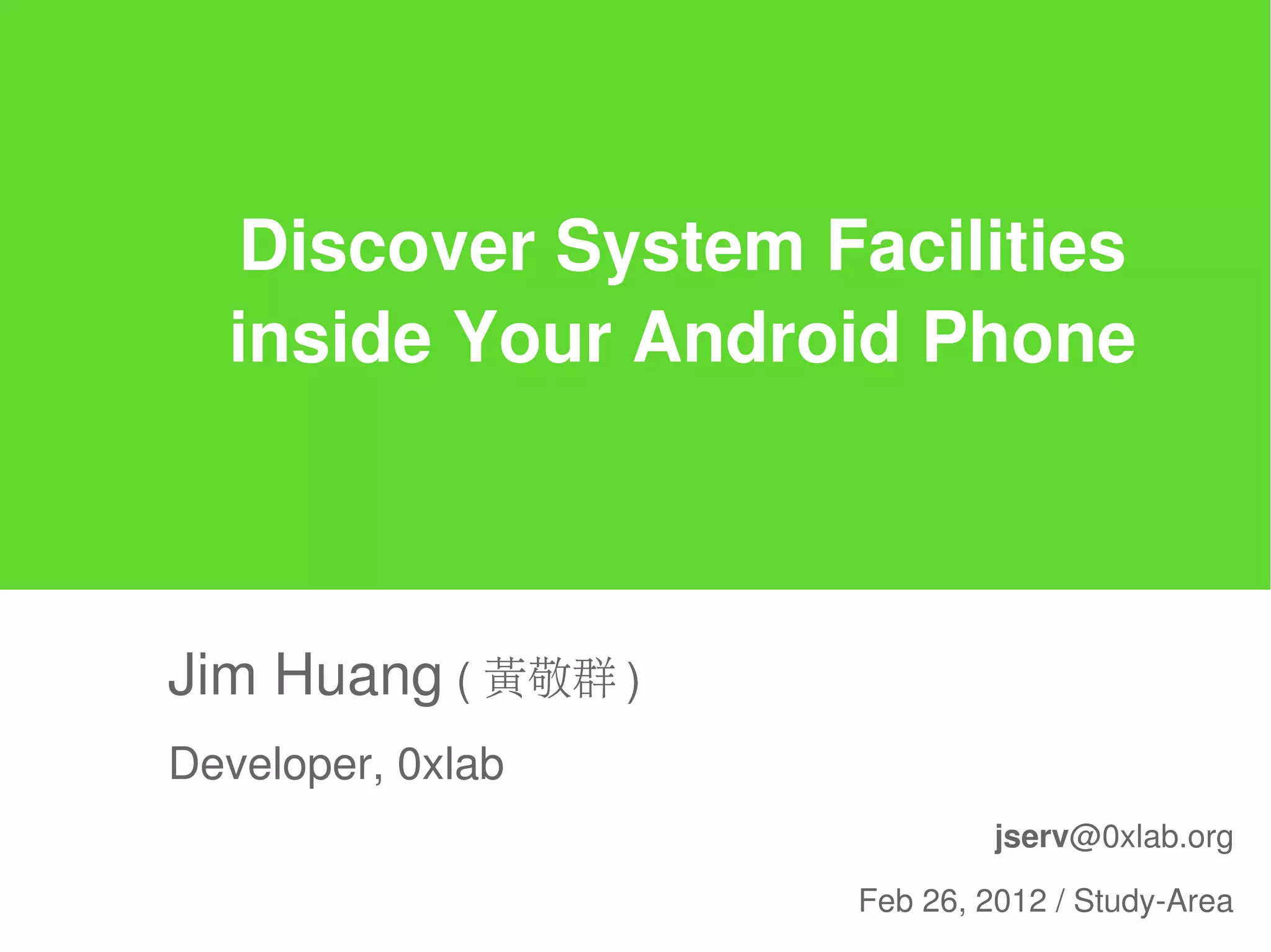 This document presents a detailed guide for developers on exploring the inner workings of Android phones, specifically focusing on system facilities and native programming. It covers environment setup, building applications, using tools like adb, and understanding dynamic linking and memory layout in Android. The document includes practical examples and instructions for creating and executing a simple 'Hello World' program on an Android device.
