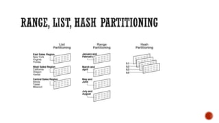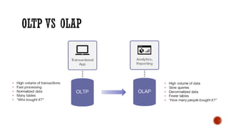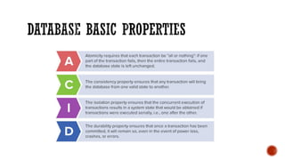 4) Additional topics such as deadlocks, OLTP vs OLAP, sharding, replication, clustering, and cloud databases.
