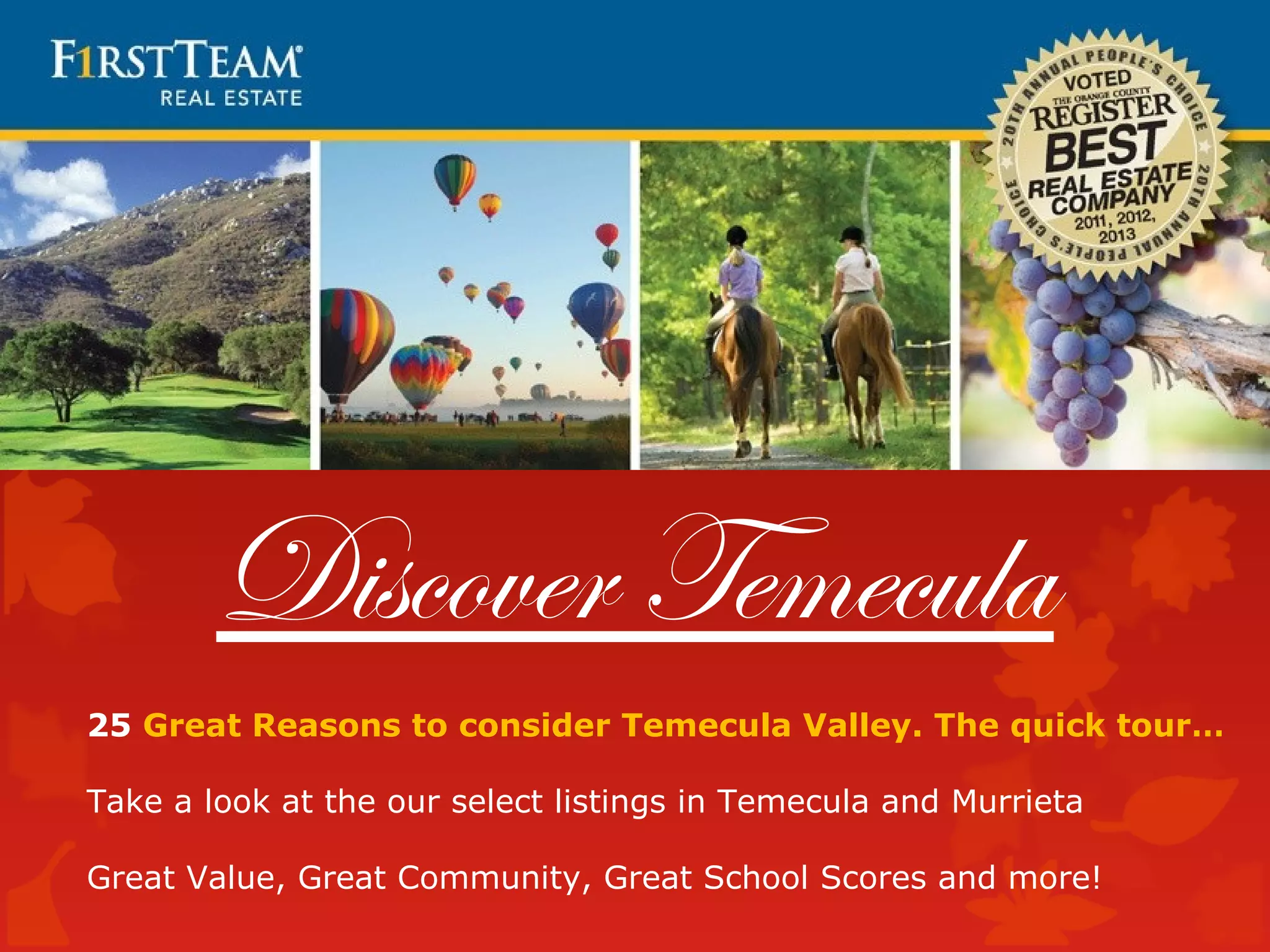 The document provides 25 reasons to consider living in Temecula Valley, California. It highlights amenities like hundreds of wineries, annual festivals, the largest casino in California, hot air ballooning, golf courses, children's museums, diverse restaurants, and more. Temecula has a young median age, an entrepreneurial spirit, and tourism is a $600 million industry. The area offers outdoor recreation near lakes and opportunities to experience western culture.