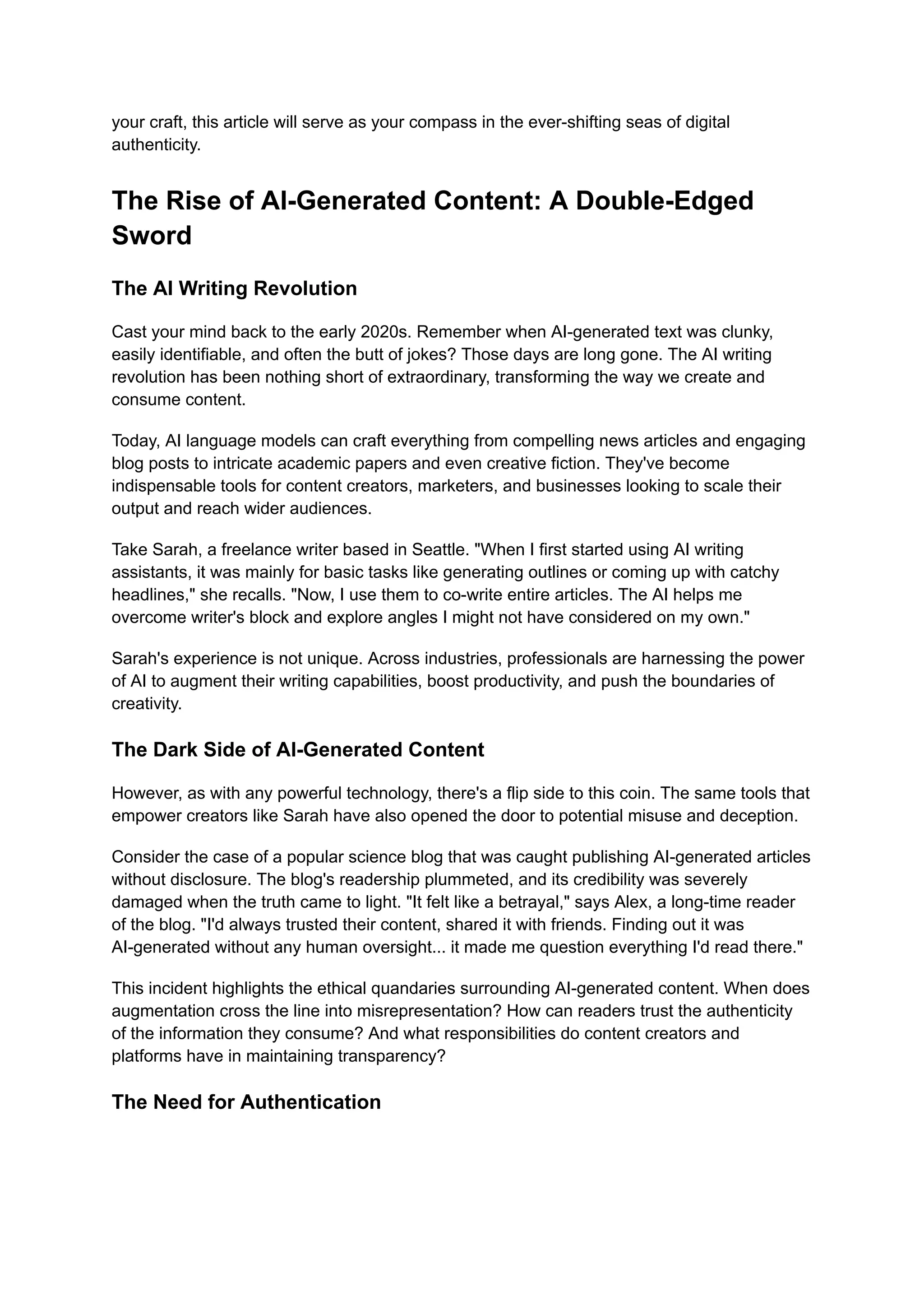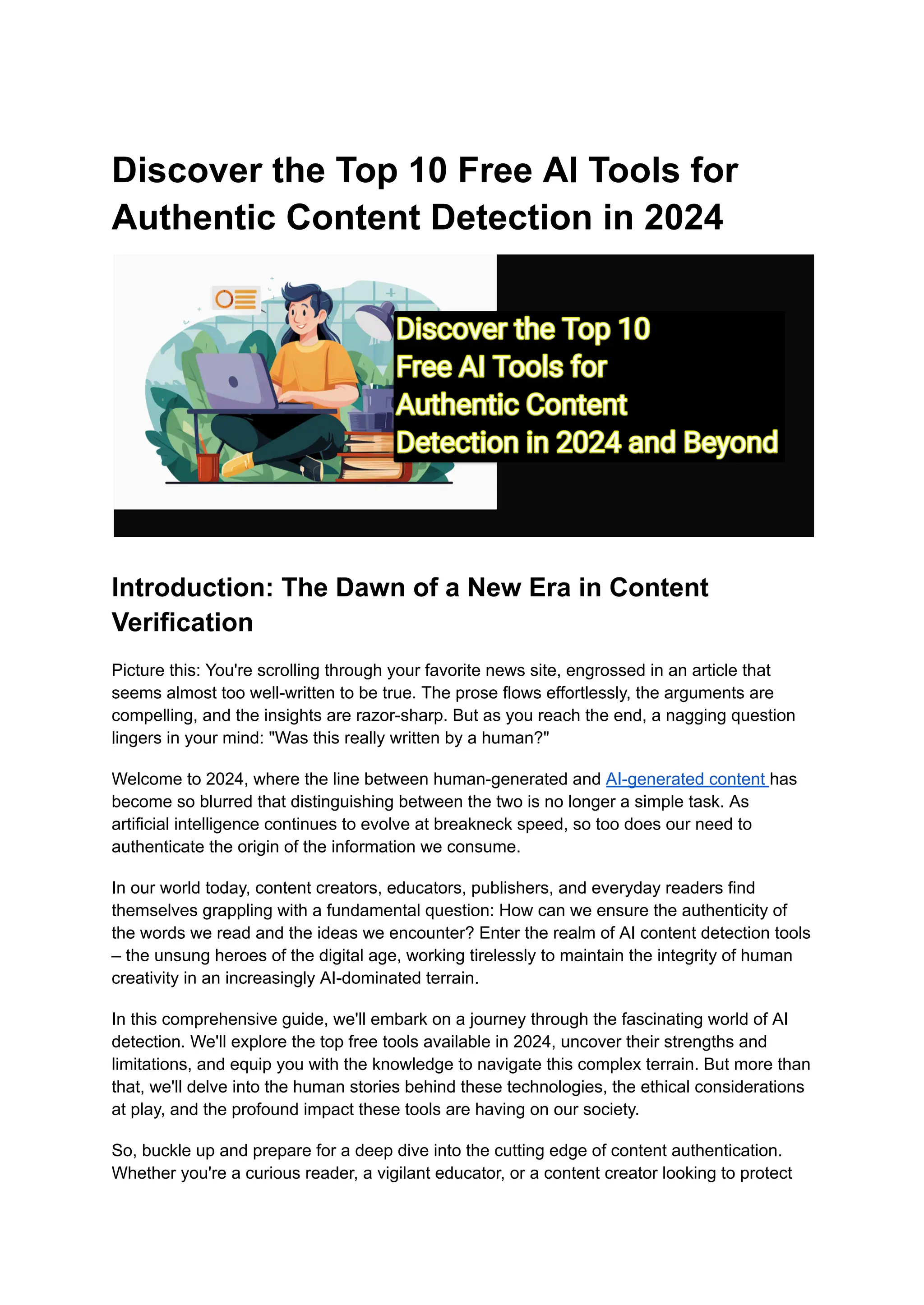 The document explores the increasing challenge of distinguishing between human-written and AI-generated content in 2024, highlighting the importance of AI content detection tools for maintaining authenticity in various fields such as academia, journalism, and marketing. It lists the top 10 free AI detection tools available, discussing their features, strengths, and limitations, while also addressing the ethical concerns and challenges posed by the rapid advancement of AI technology. The article emphasizes the need for these tools as guardians of digital integrity in an era where AI-generated content has become ubiquitous.