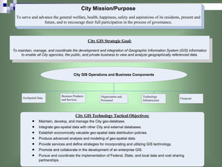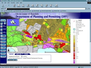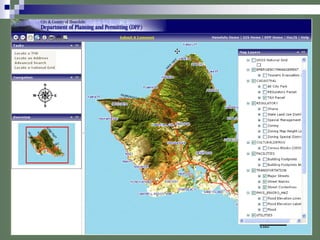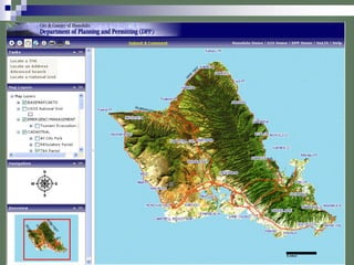 This document summarizes the strategic plan and activities of the Honolulu Land Information System (Holis) department. Holis provides critical geospatial data and services to support business processes and decision making across the city. Key accomplishments in recent years include updating parcel and infrastructure data, producing maps, and developing web-based GIS interfaces. Holis aims to continue enhancing productivity through improved work processes, data management, and new technologies.