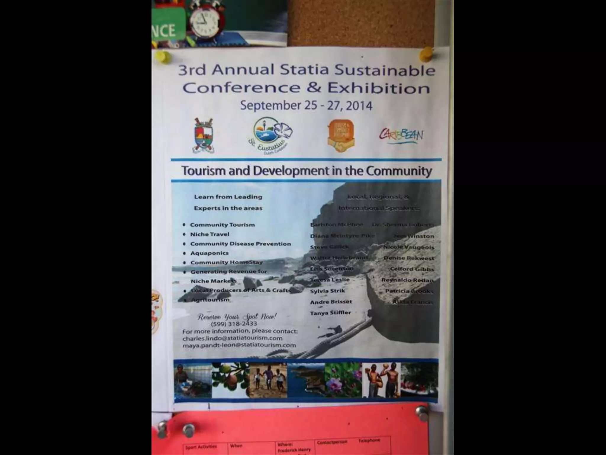 This document provides a summary of a trip to the island of St. Eustatius (Statia). It describes taking a short flight from St. Martin, landing at the airport, and visiting various sites around the island including the Old Gin House Hotel, ruins, a historical foundation museum, Fort Oranje, a Jewish cemetery, and climbing the dormant volcano called The Quill. It also discusses attending a sustainability conference on the island where various topics were presented, and provides photos from locations visited and events during the trip.