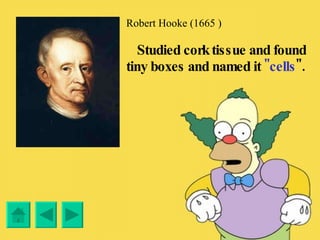 The document outlines the historical development of cell theory, beginning with Robert Hooke's discovery of cells in cork in 1665, followed by the identification of the nucleus by scientists in the early 19th century. It highlights contributions from Matthias Schleiden and Theodor Schwann, who established that all plants and animals are made of cells, and Louis Pasteur's work on microorganisms and vaccination. Notable achievements mentioned include the germ theory, the first vaccine against rabies, and the discovery of antibiotics.