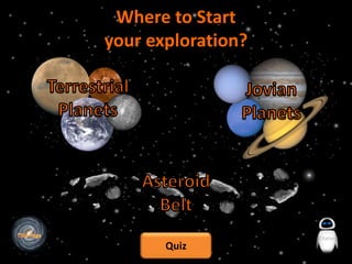 The document provides information about planets and exploration in our solar system. It begins with an introduction to Mercury as the closest planet to the sun and describes it as having many craters due to being geologically inactive. It then discusses past missions like Mariner 10 and current missions like Messenger that have visited Mercury. The document continues describing each planet and some notable missions that have explored them, including details about Mars rovers and future plans like Curiosity. It concludes with sections on asteroids, the asteroid belt, and the Dawn mission.
