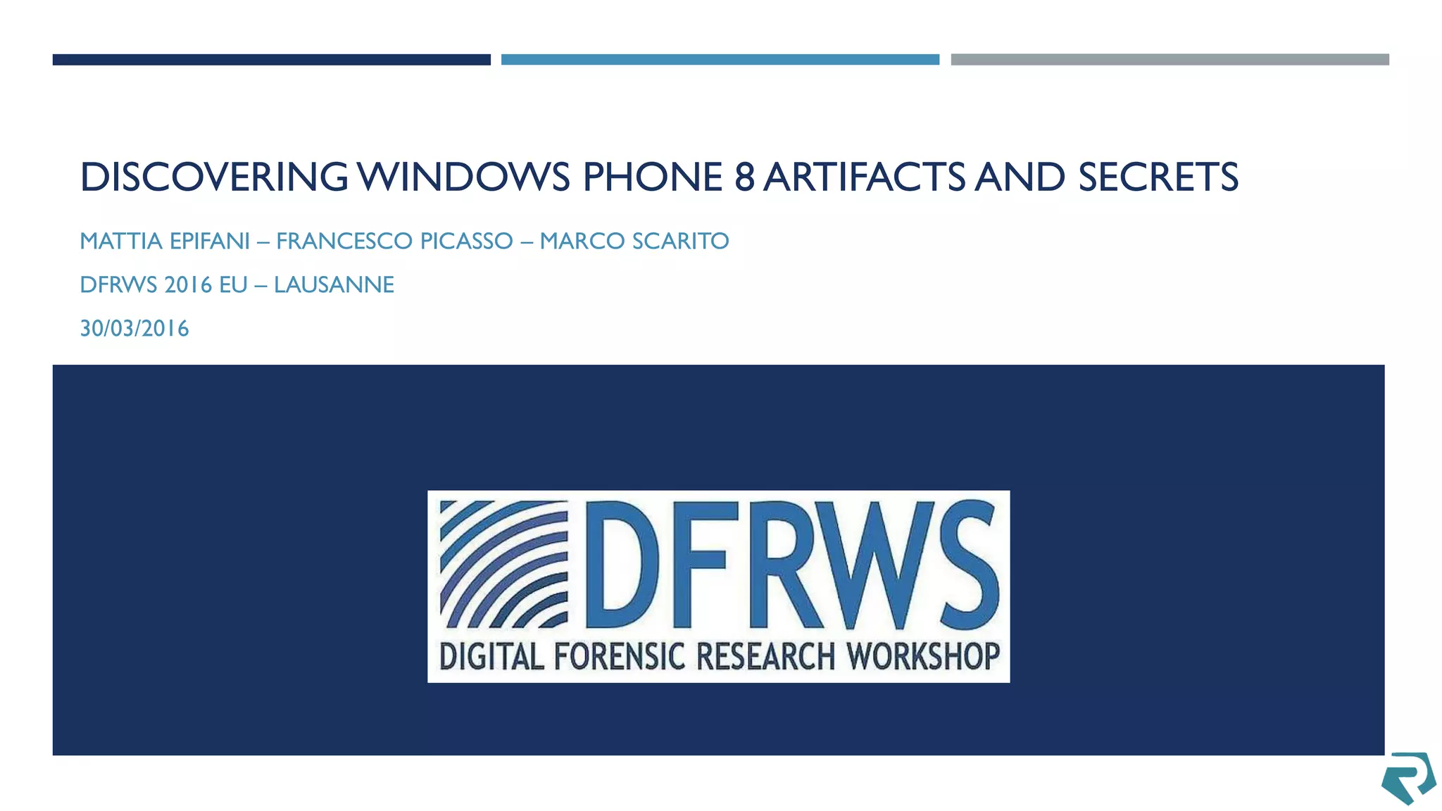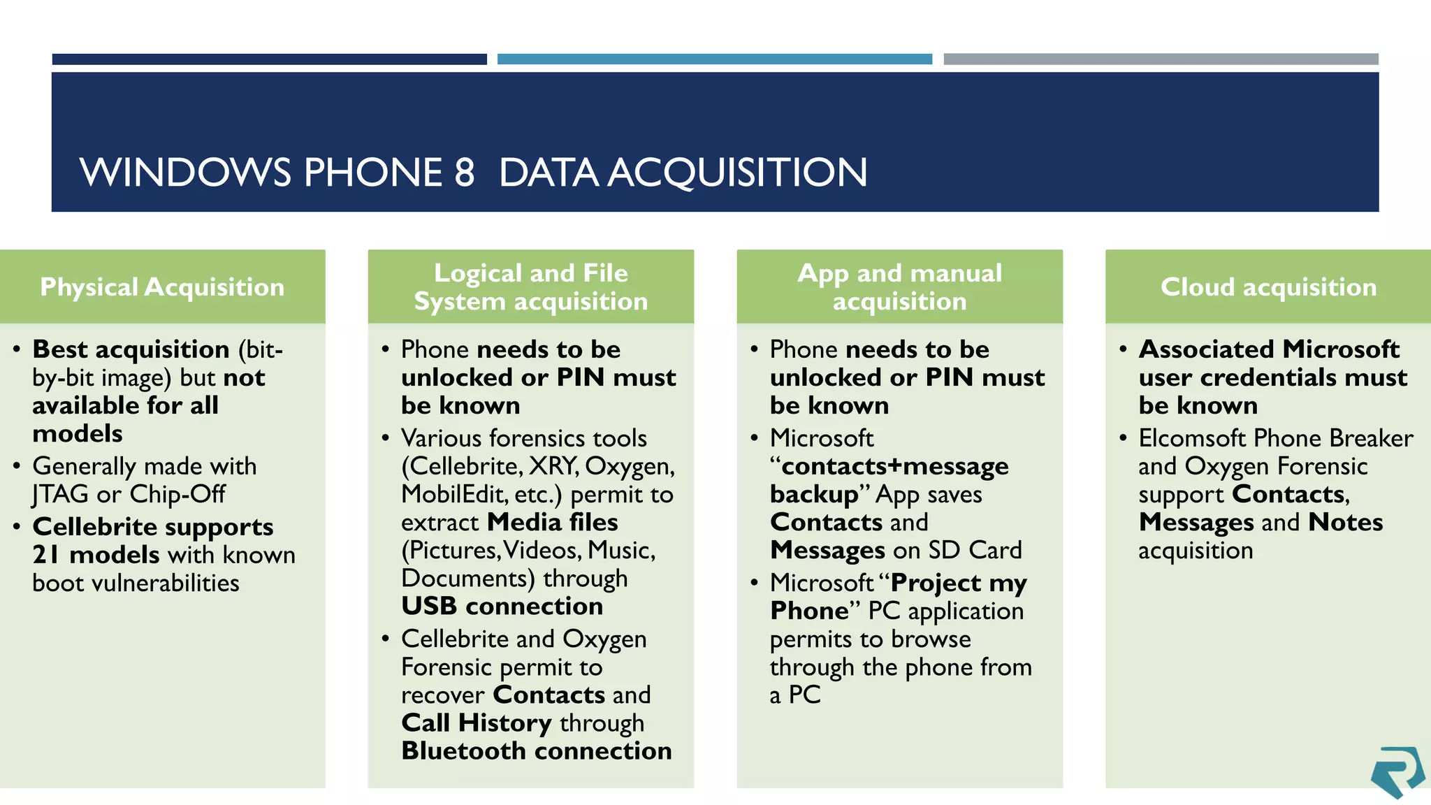 This document discusses methods for acquiring and analyzing data from Windows Phone 8 devices through physical acquisition, logical acquisition from connected devices, and analyzing application data and secrets stored on the devices. It describes partitioning the devices' storage and extracting useful data like contacts, call history, messages, and application data from databases and folders. It also details extracting decrypted user passwords from the registry and decrypting DPAPI blobs to potentially access encrypted vaults containing email passwords and tokens.