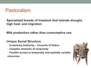 This document summarizes Ryan Unks' research on linking pastoralism and landscape ecology in Laikipia County, Kenya. It discusses how pastoralist herding practices have changed over time due to loss of land and influences of the market. Vegetation across the landscape has also changed, with increases in unpalatable species and decreases in species important for pastoralists. The research aims to understand how social and institutional factors influence grazing practices and spatial relationships between plant communities and grazing. The goal is to explore implications of interrelated social and ecological changes for livelihoods and natural resource management. Methods include interviews, surveys, satellite image analysis, and plant community analysis.
