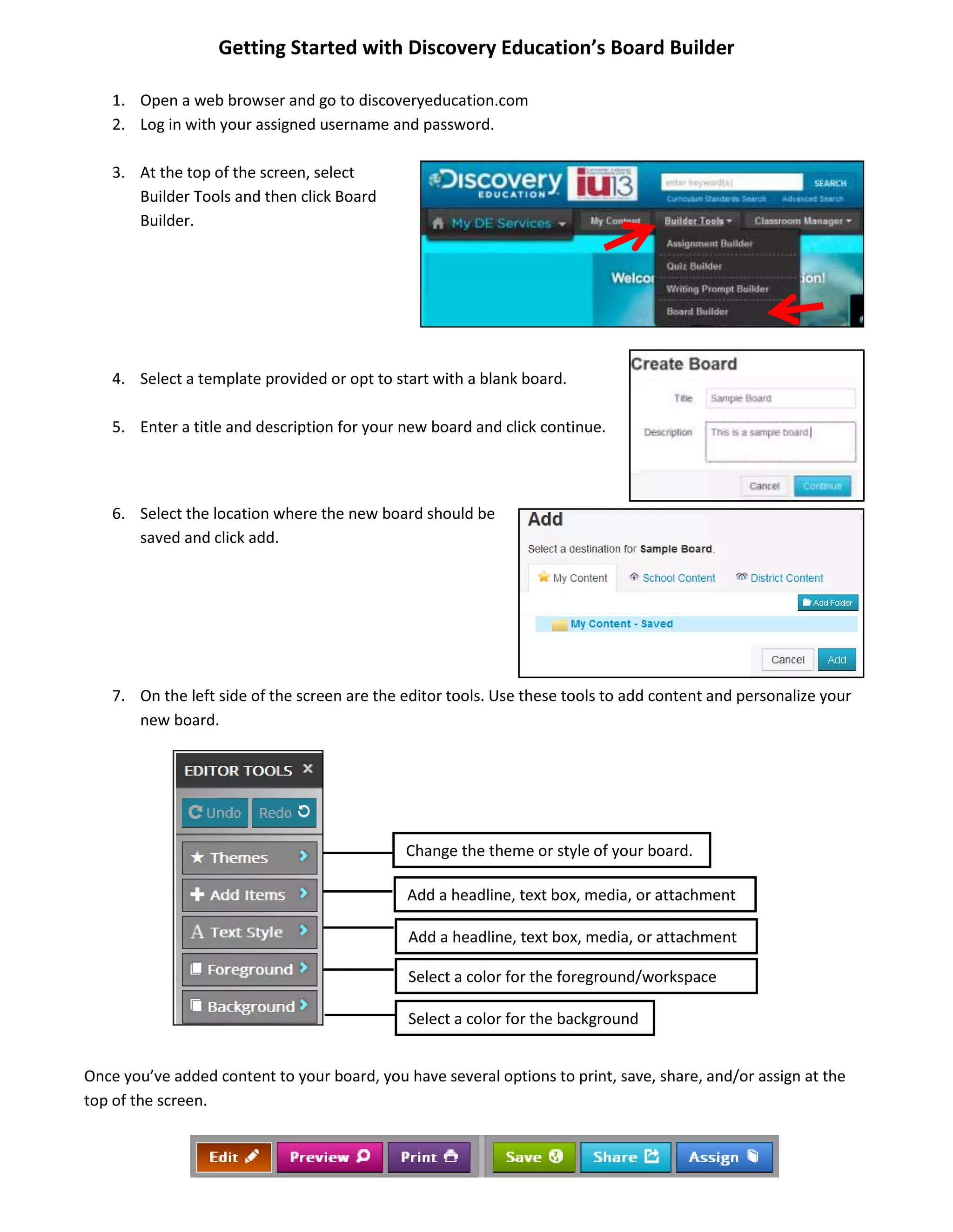 To create a board using Discovery Education's Board Builder: log into the discoveryeducation website, select the Board Builder tool, choose a template or blank board, enter a title and description, select a location to save the board, then use the editor tools to add content like headlines, text boxes, media or attachments while customizing features such as theme, colors, and more. Finally, print, save, share or assign the completed board.