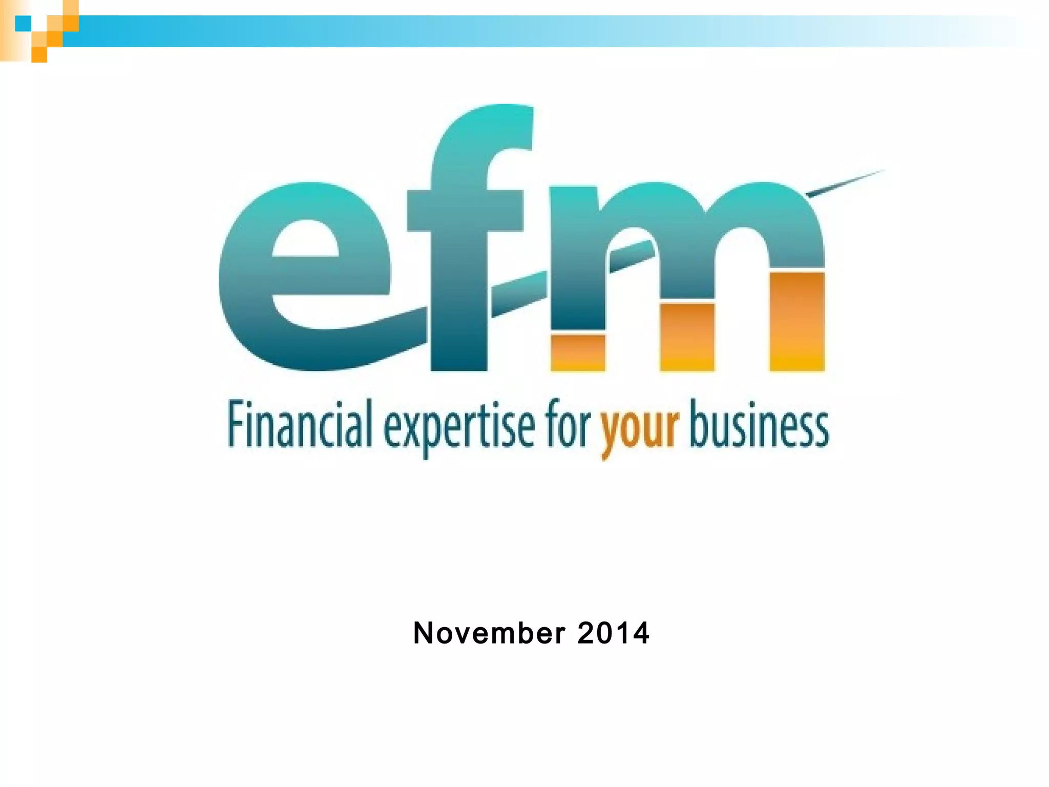 EFM is a financial outsourcing company that offers flexible financial management solutions primarily for SMEs across the UK, founded in 2000. The organization provides services such as finance directors and bookkeeping, while aiming to be the leading provider in the sector through a network of self-employed professionals. EFM offers comprehensive support and resources for its associates, including training, business development coaching, and marketing support, while maintaining a license agreement rather than a franchise model.