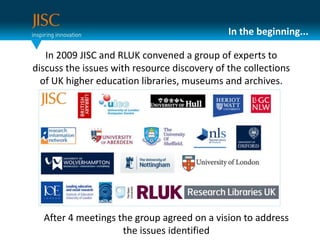 This document summarizes the work of the Research Data and Discovery Task Force (RDTF) to improve resource discovery across UK higher education libraries, museums, and archives. It discusses the RDTF's vision and goals to create an integrated and seamless method of accessing these collections by 2012. It provides updates on projects and metadata work to aggregate data and develop innovative discovery services. It announces the launch of a new phase called UK Discovery to further engage stakeholders and explore what open data can enable through real-world examples and case studies.