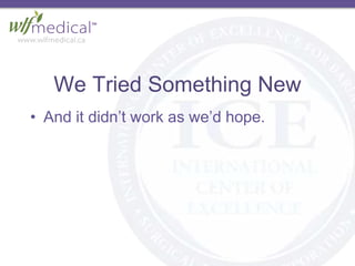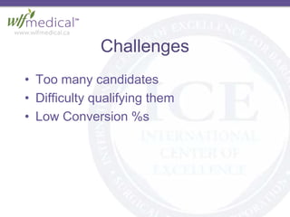 We tried a new approach that did not work as hoped. There were too many candidates, difficulty qualifying them, and low conversion rates. Possible reasons included currency exchange rates, losing potential patients between initial contact and assessments, and providing too much information too early without focusing on patients' needs. The document recommends using a "discovery method" where the facilitator asks open-ended questions to understand the patient's perspective and story rather than telling them information. The patient should talk 80% of the time while the facilitator guides the discussion to learn about the patient's specific situation and concerns.