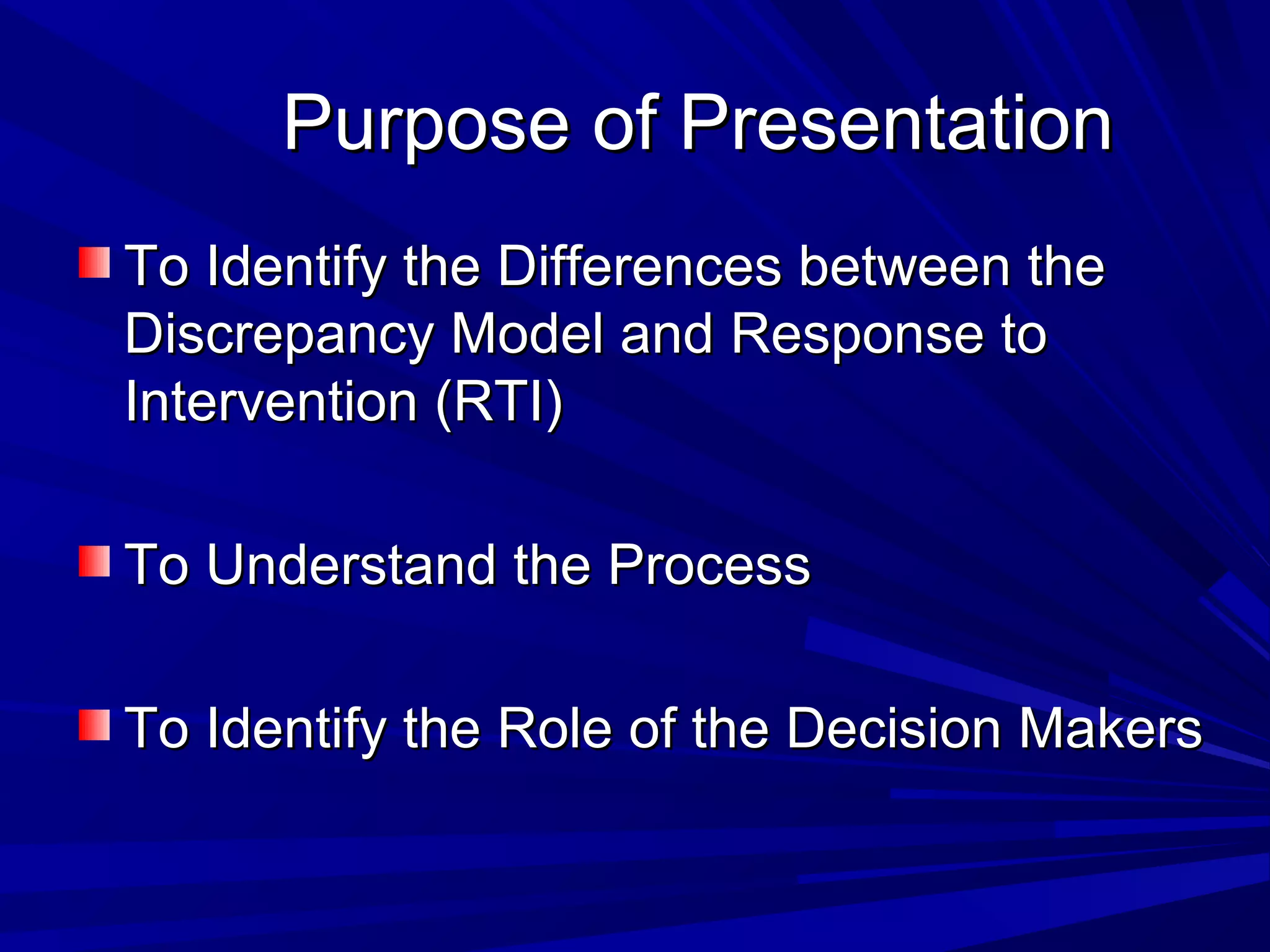 The presentation compared the discrepancy model and response to intervention (RTI) approaches for identifying learning disabilities. The discrepancy model focuses on identifying a disability through IQ-achievement discrepancies, while RTI uses data-driven interventions and progress monitoring. RTI aims to intervene early through research-based practices and determine if core instruction or supplemental support is needed. A multi-disciplinary team collaborates within the RTI process to problem-solve effective interventions based on frequent progress monitoring. The principal's role is to support RTI implementation through resource allocation, priority setting, and program evaluation.