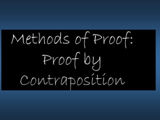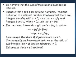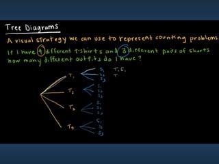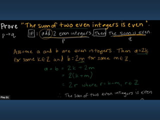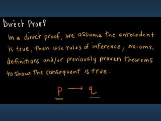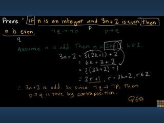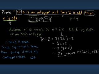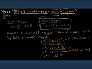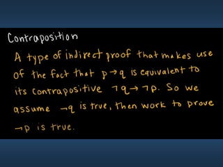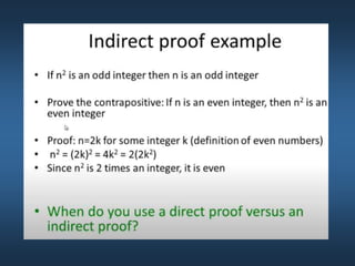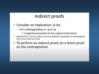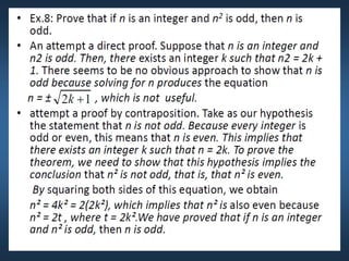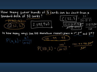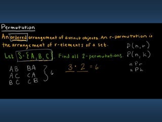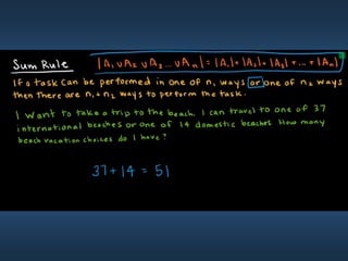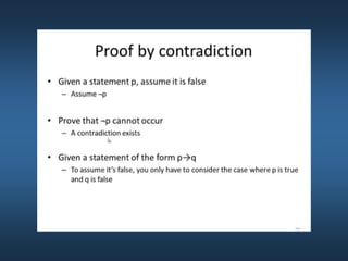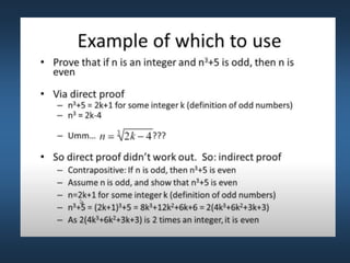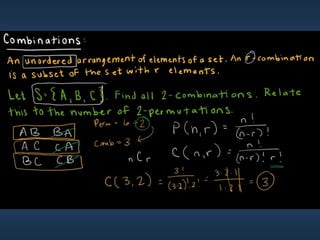 This document summarizes key concepts from Chapter 5 on counting principles, permutations, and combinations. It introduces the product rule and sum rule for counting the number of possible outcomes of multi-step processes. It then covers permutations, which are ordered arrangements, and combinations, which are unordered selections of elements from a set. Examples are provided to illustrate calculating permutations and combinations using formulas like P(n,r) and C(n,r). The chapter also discusses proof techniques like direct proof, proof by contradiction, and proof by contraposition.