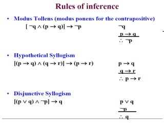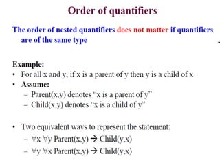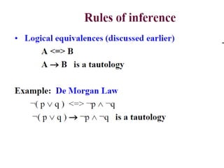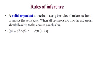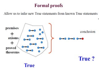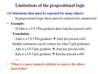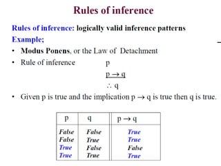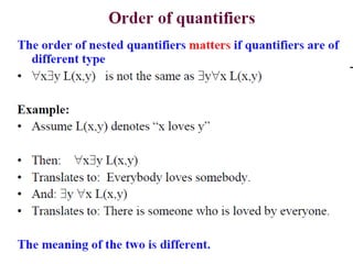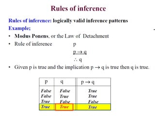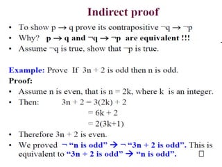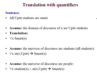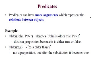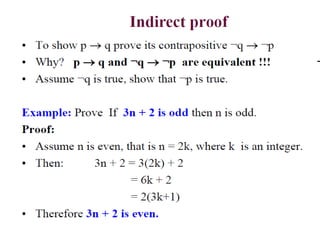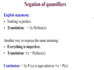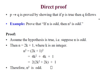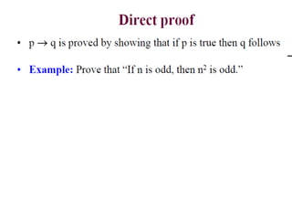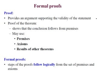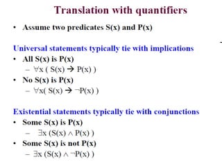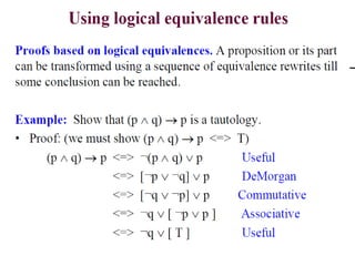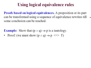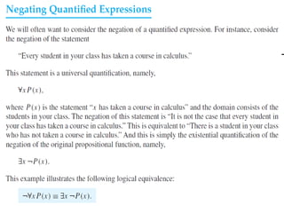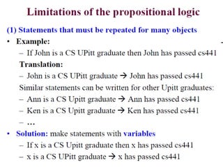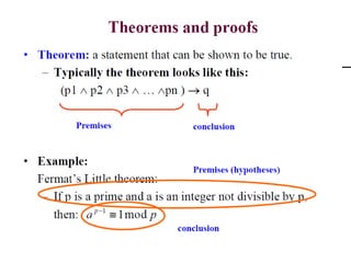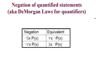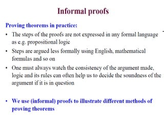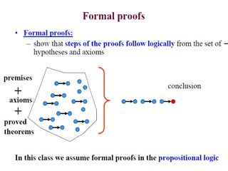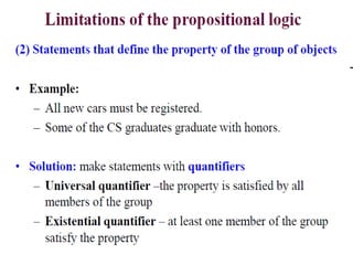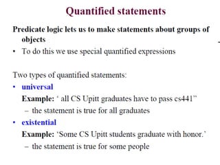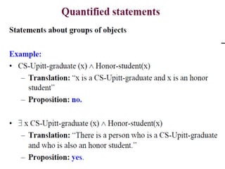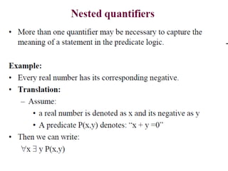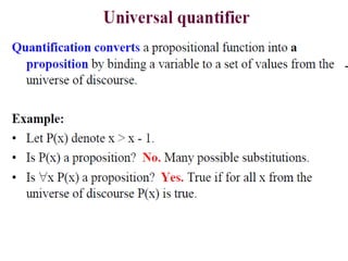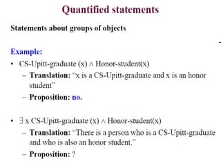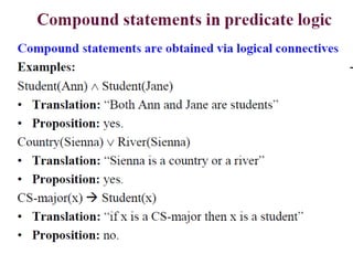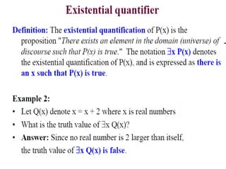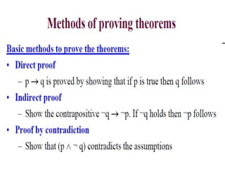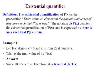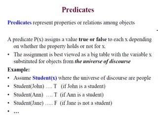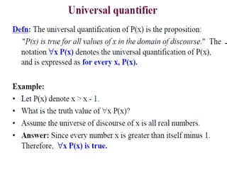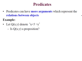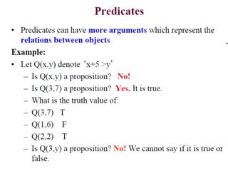 The document discusses predicates and propositional functions, emphasizing their roles in defining properties of variables. It explains how truth values are determined through examples and introduces logic circuits related to propositional logic. Additionally, it touches on formal and informal proofs, including proof by contradiction.
