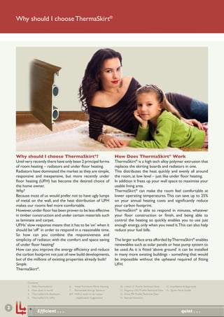 ThermaSkirt is a heating skirting board that provides several benefits over traditional radiators and underfloor heating. It distributes heat evenly around the room at low level, doesn't take up wall space, and can save up to 25% on heating costs. ThermaSkirt works with any floor type or covering and can heat a room more efficiently than a radiator by avoiding hot and cold spots. It also responds faster than underfloor heating and can be used with renewable energy sources better than radiators. ThermaSkirt provides a simple, discreet way to heat rooms while maximizing space.