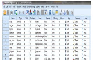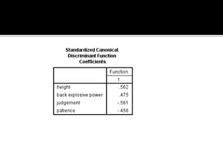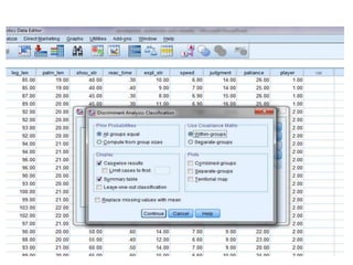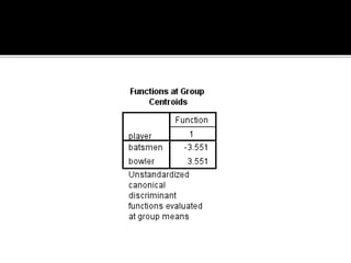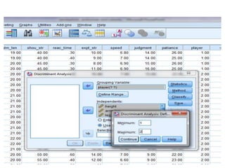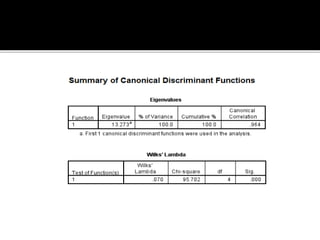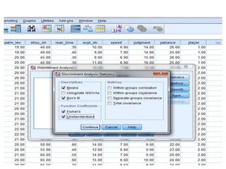 Discriminant analysis is a statistical technique used to classify individuals or cases into groups based on a set of predictor variables. It can be used to determine which variables discriminate between two or more naturally occurring groups and to classify new observations into one of the existing groups. The key steps involve developing a discriminant function using a linear combination of predictors, evaluating the accuracy of classification, and determining the relative importance of predictors in discriminating between groups. Discriminant analysis requires certain assumptions about the data such as normality and equality of group variances to be valid.