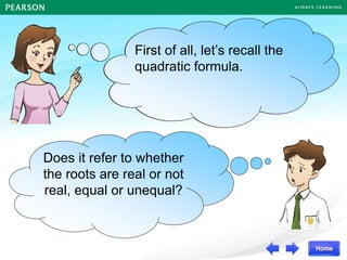 The document discusses the nature of roots of a quadratic equation and how it relates to the discriminant. It begins by recalling the quadratic formula and defining the discriminant. It then describes the three cases for the nature of roots based on the discriminant: