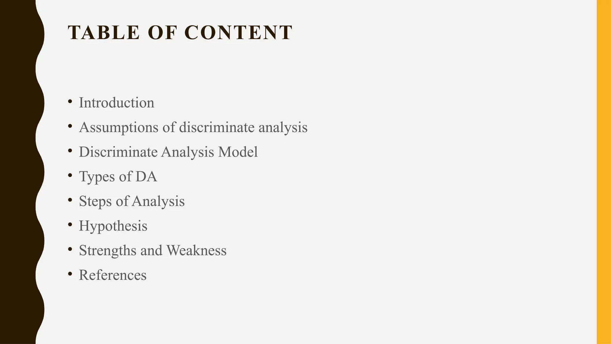 Discriminant Analysis (DA) is a statistical method for classifying observations into predefined groups by analyzing the relationship between a dependent variable and multiple independent variables. It is effective for normally distributed data and can either be linear or multiple depending on the number of categories involved. The document outlines the assumptions, steps involved in DA, types, and compares it with other statistical methods like ANOVA and regression.