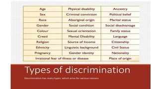 Discrimination means treating someone unfairly based on their inherent characteristics such as their age, race, gender or disability status. The Equality Act makes it unlawful to discriminate against someone due to protected characteristics. Discrimination can also occur if someone is treated unfavorably because they are assumed to have a protected characteristic, even if they do not actually possess that characteristic.