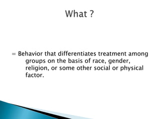 Discrimination can take many forms, including racial, sexual, and indirect discrimination. Racial discrimination involves using vulgar language or treating someone differently based on their race. Sexual discrimination is treating someone differently due to their gender. Victimization occurs when someone faces discrimination for complaining about discrimination or supporting those who do. To prevent discrimination, organizations should conduct training, reward diverse behaviors, encourage employees to understand each other, and allow reporting of issues to managers.