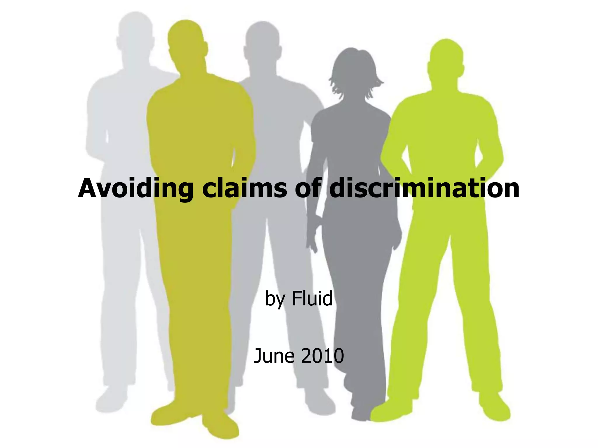 The document outlines various aspects of discrimination law, focusing on ageism, disability, gender, race, religion, sexual orientation, and smoking, providing legal considerations and best practices for employers. It discusses the Equality Act and its implications for protecting against discrimination, as well as the need for employers to acknowledge biases and make reasonable adjustments. The document includes exercises, case studies, and guidance for both employers and victims of discrimination.
