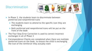 1) The document discusses procedures for discrimination training, including using preferred and non-preferred icons, error correction, and correspondence checks.