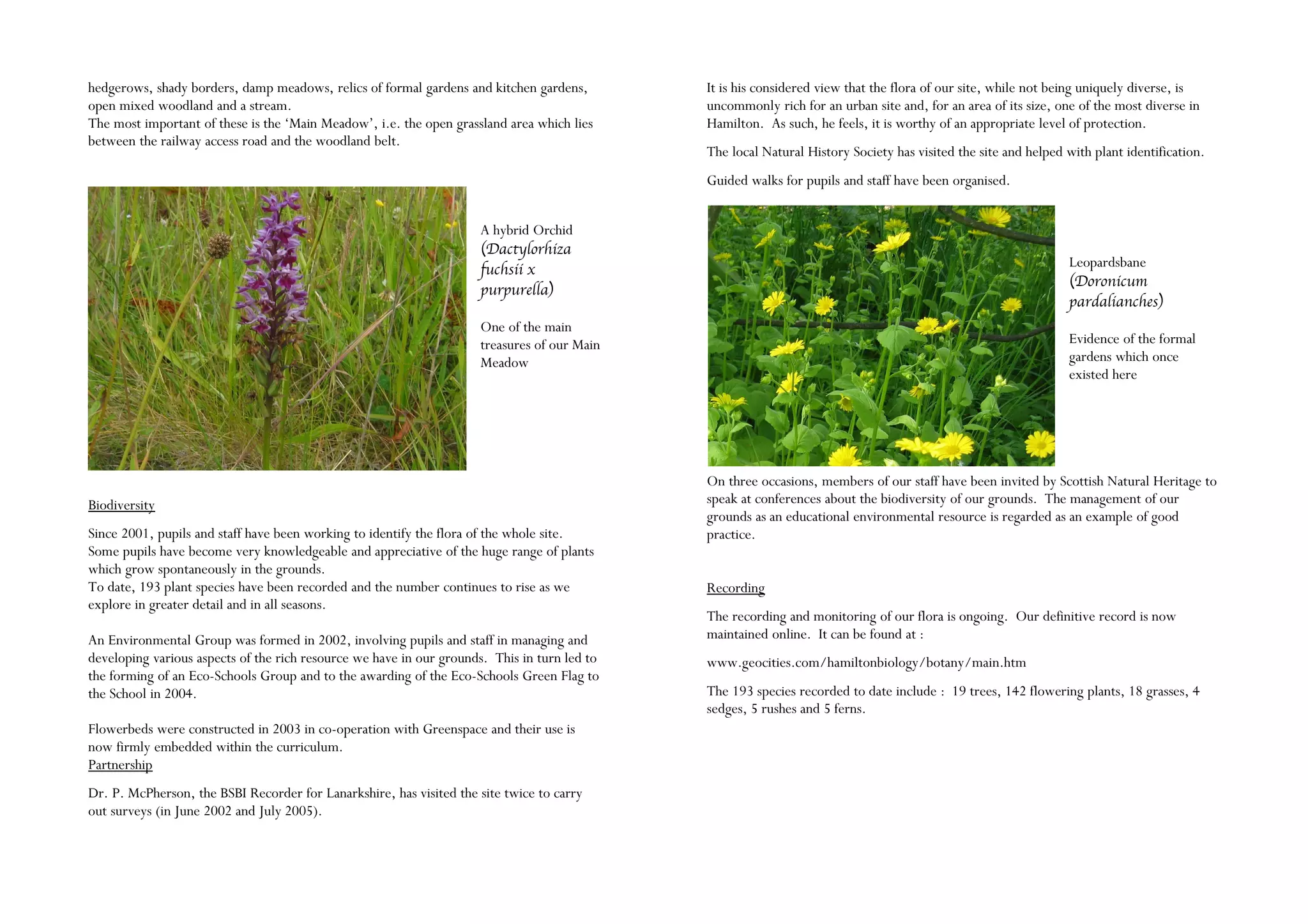 The document describes the botanical diversity of the grounds of a school located on formerly cultivated land. It notes that the school grounds contain a variety of habitats including lawns, woodlands, and a unique meadow habitat, and are home to several uncommon plant species including various orchid species. A botanical study conducted since 2001 has identified 193 plant species on the grounds. Experts have recognized the grounds as an unusually botanically rich urban site worthy of protection for its biodiversity.