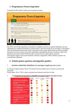 Documentul abordează conceptul de programare neuro-lingvistică (PNL) și importanța convingerilor personale în realizarea potențialului uman. De asemenea, oferă tehnici pentru sporirea convingerilor pozitive și discută despre coaching pentru performanță, subliniind rolul acestuia în creșterea încrederii în sine și a responsabilității angajaților. La final, se prezintă tipurile de temperament și modul în care acestea influențează interacțiunile sociale și performanța profesională.
