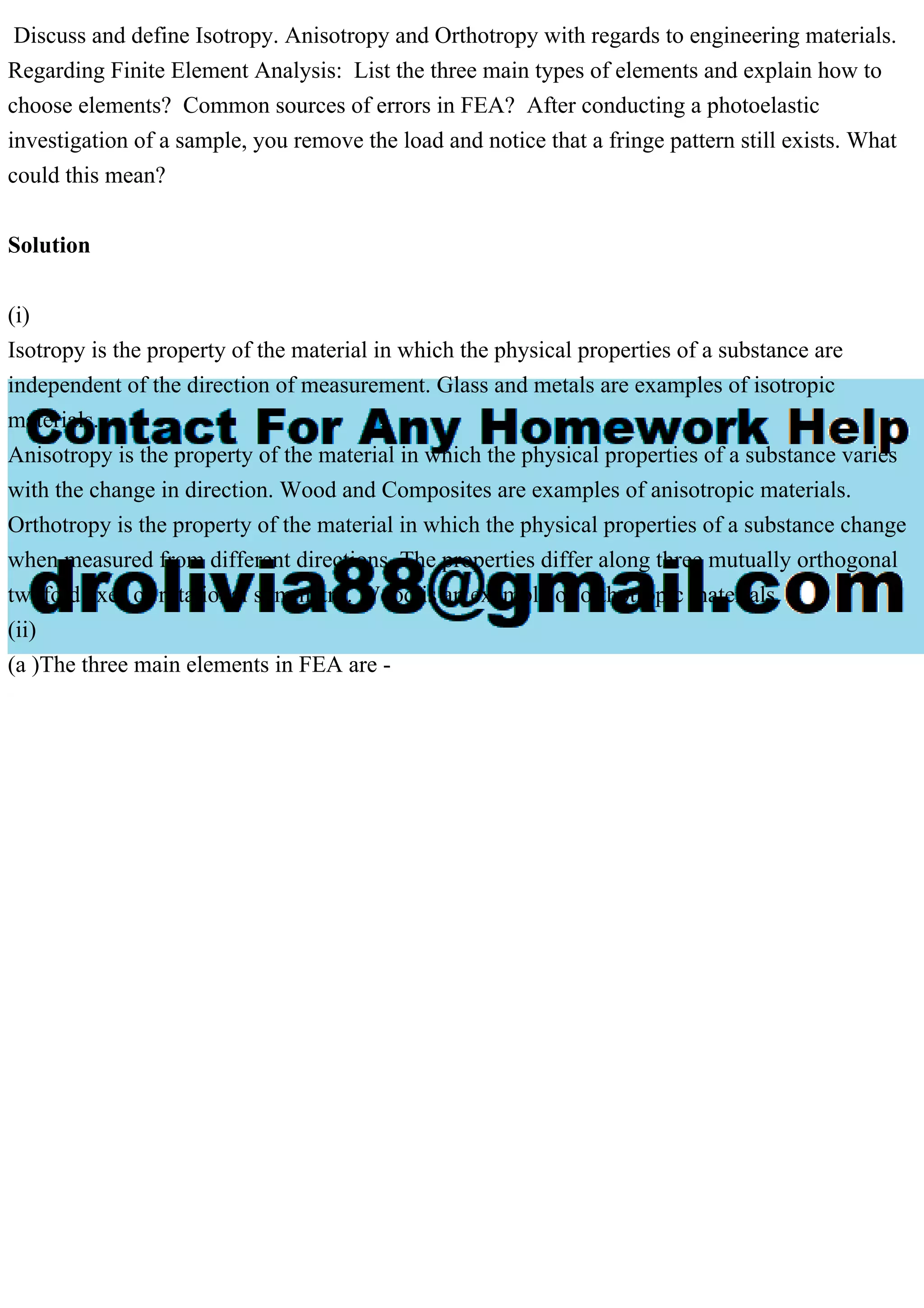 The document discusses the definitions of isotropy, anisotropy, and orthotropy with regards to engineering materials, providing examples like glass and metals for isotropic materials, wood and composites for anisotropic materials, and wood as an orthotropic material. It also outlines the three main types of finite element analysis (FEA) elements and touches on common errors encountered during FEA. Additionally, it raises a question about the significance of a persistent fringe pattern after removing the load in a photoelastic investigation.