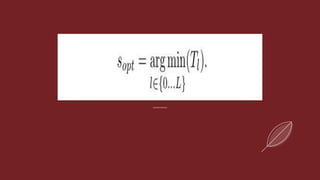 The document discusses the optimization of split computing in IoT devices by dynamically selecting the optimal splitting layer based on prediction confidence and computational costs. It highlights the early exit technique in deep neural networks for reducing inference time and computational load, particularly in resource-constrained environments. Key variables include total inference time, compression ratio, and costs associated with offloading and computation at the splitting layer.