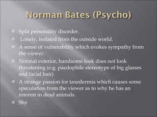The document describes two different personalities. The first personality is a lonely man with a normal, handsome appearance who has a strange passion for taxidermy, causing speculation about his interests. The second personality is a rough, hot-headed, and physically aggressive person with threatening behavior and schizophrenic tendencies who is sarcastic.