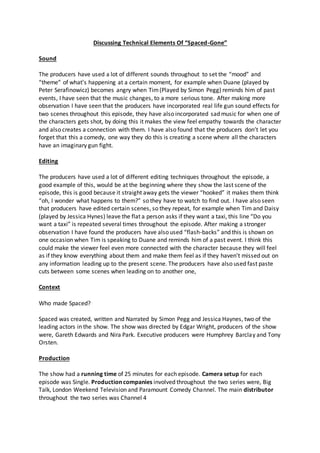 The document discusses technical elements of the TV show "Spaced", including sound, editing, and context. It notes that the producers used different sounds to set moods and themes. They incorporated realistic gun sounds and sad music. Editing techniques included starting with the ending scene to hook viewers and repeating lines to emphasize them. Flashbacks were also used to help viewers feel more connected to characters. The show was created and directed by Simon Pegg and Edgar Wright and aired on Channel 4 from 1999 to 2001.