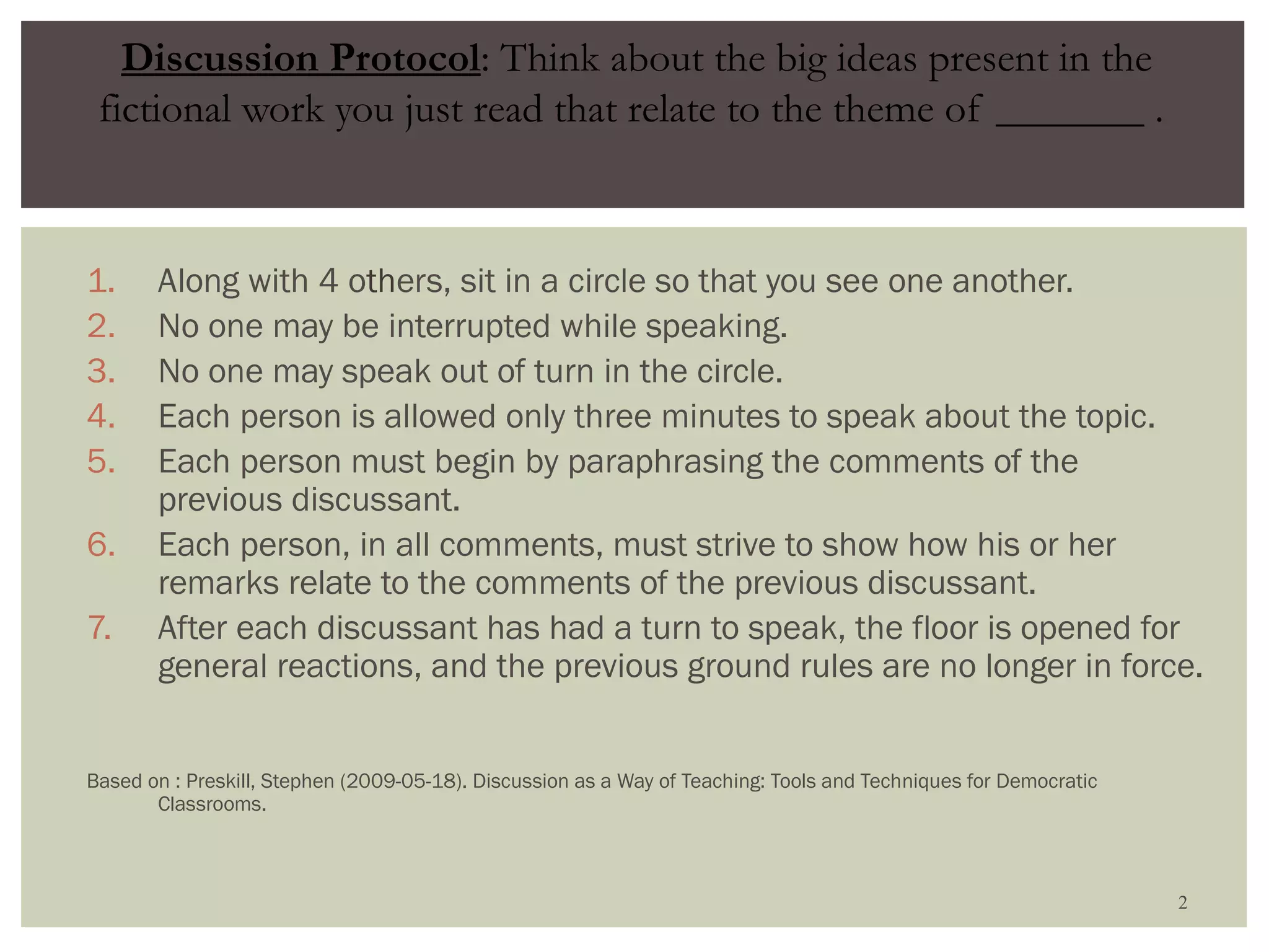 The document provides several discussion protocols and techniques for facilitating classroom discussions, as outlined in Stephen Preskill's book "Discussion as a Way of Teaching." It describes various structured approaches for discussions, including having students sit in a circle and take turns speaking according to specific guidelines, splitting into small groups to discuss topics before reconvening in larger groups, using notecards for students to write reflections or quotes, and allowing students to write responses on newsprint or a chalkboard to generate discussion. The purpose of these protocols and techniques is to encourage democratic and thoughtful classroom conversations.