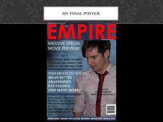 The document discusses the conventions used in designing a magazine cover for a class project. It describes using the recognizable magazine title "Empire" to attract an audience. Date and price are included as they are fundamental for consumers. The website is added to increase accessibility. Fonts and colors are varied throughout to make the cover eye-catching while maintaining continuity. An actor is featured in a suit rather than looking disheveled to portray a different message. Details included relate to the film and other student films. A barcode and banners/separators are used to break up blocks of text as seen in other magazines.