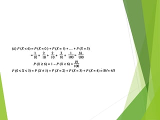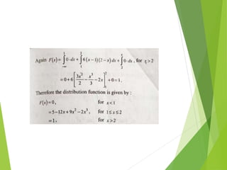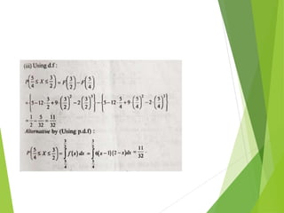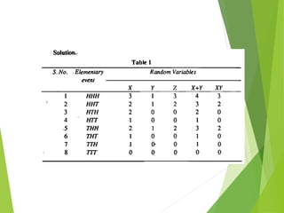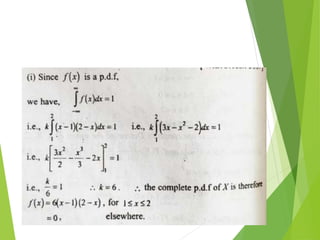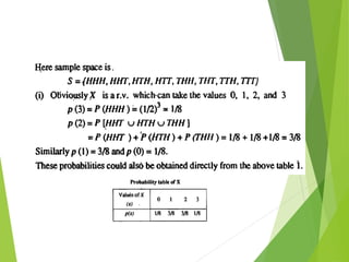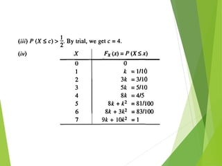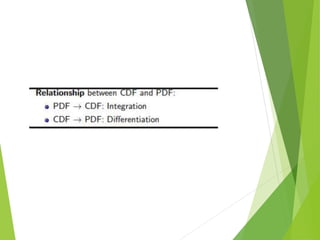 The document provides an overview of random variables, categorizing them into discrete and continuous types. It includes examples of each type and discusses probability distributions, probability mass functions (pmf), and cumulative distribution functions (cdf). The document also features problems to illustrate the concepts of probability related to random variables.