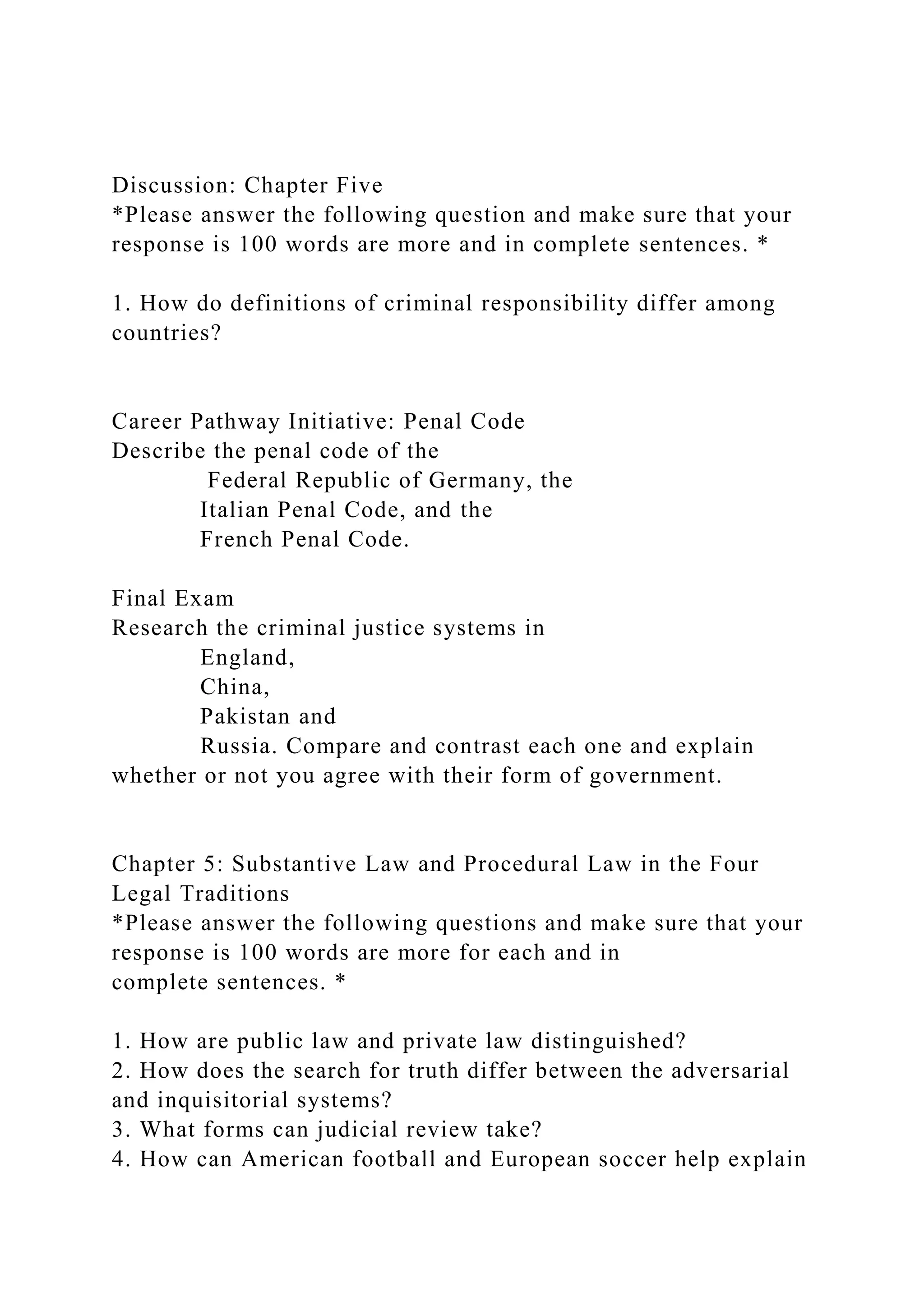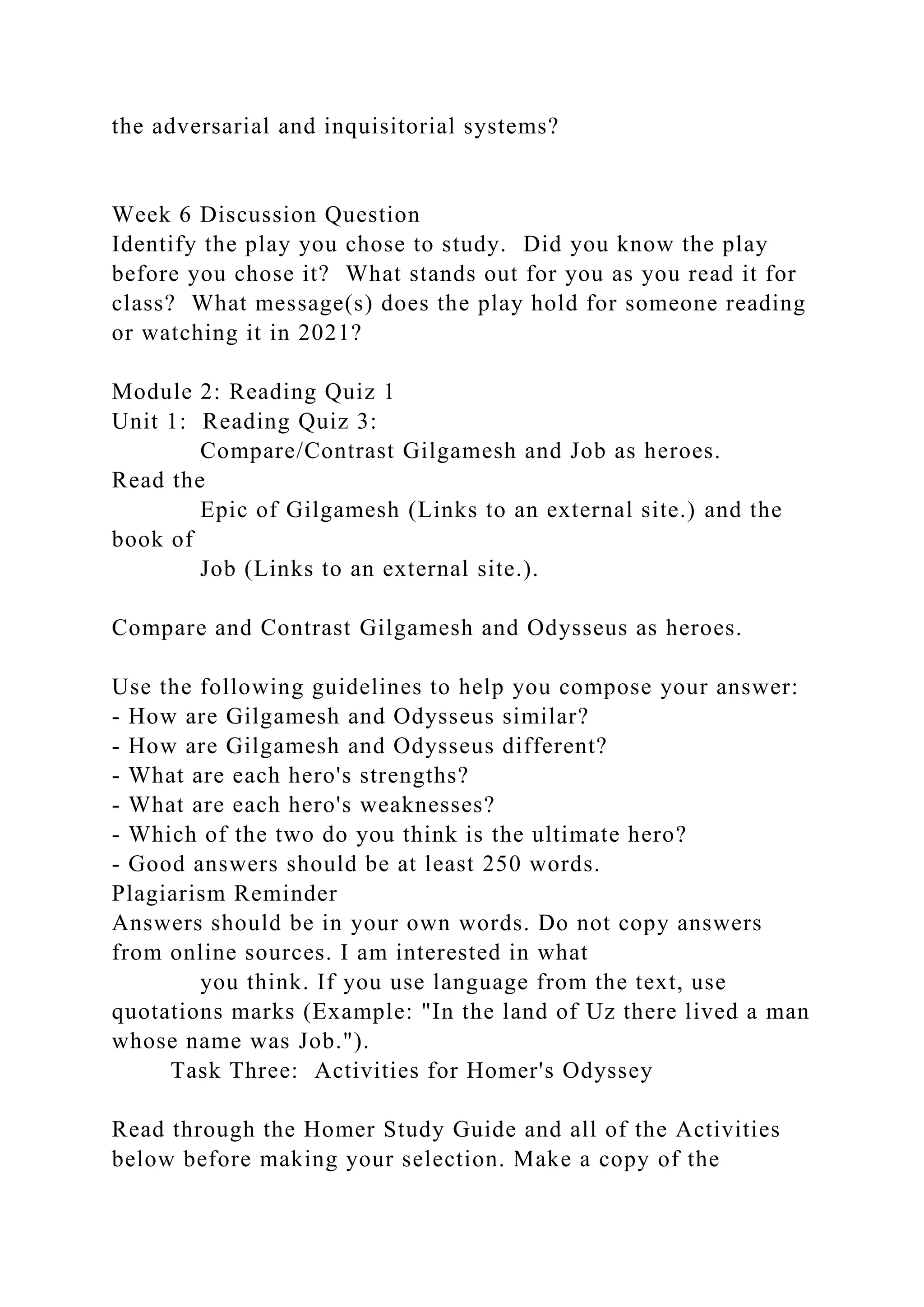 The document outlines various academic tasks related to the study of criminal justice, literature, and ancient epics like Gilgamesh and the Odyssey. It includes prompts for discussions, essays, and quizzes, focusing on themes such as definitions of criminal responsibility, comparisons between legal systems, and character analysis of heroes. Additionally, it emphasizes the importance of original thought in responses and the exploration of complex themes in the narratives examined.