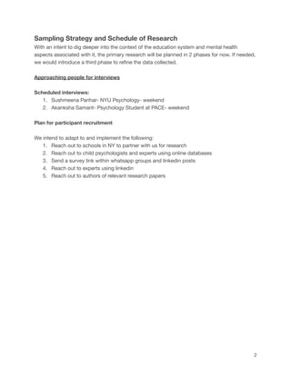 This document outlines the research plan and methodology for a project studying depression and anxiety in children aged 10-14 in the American public education system. It includes details on stakeholder interviews and surveys with parents. The research will be conducted in two phases, starting with qualitative interviews of various stakeholders including school psychologists, teachers, and clinical psychologists. Interview guides are provided. A parent survey is also outlined to understand factors influencing school choice, perceptions of children's mental health, and effective approaches to education. The goal is to identify problems children face and potential solutions to improve mental health support.