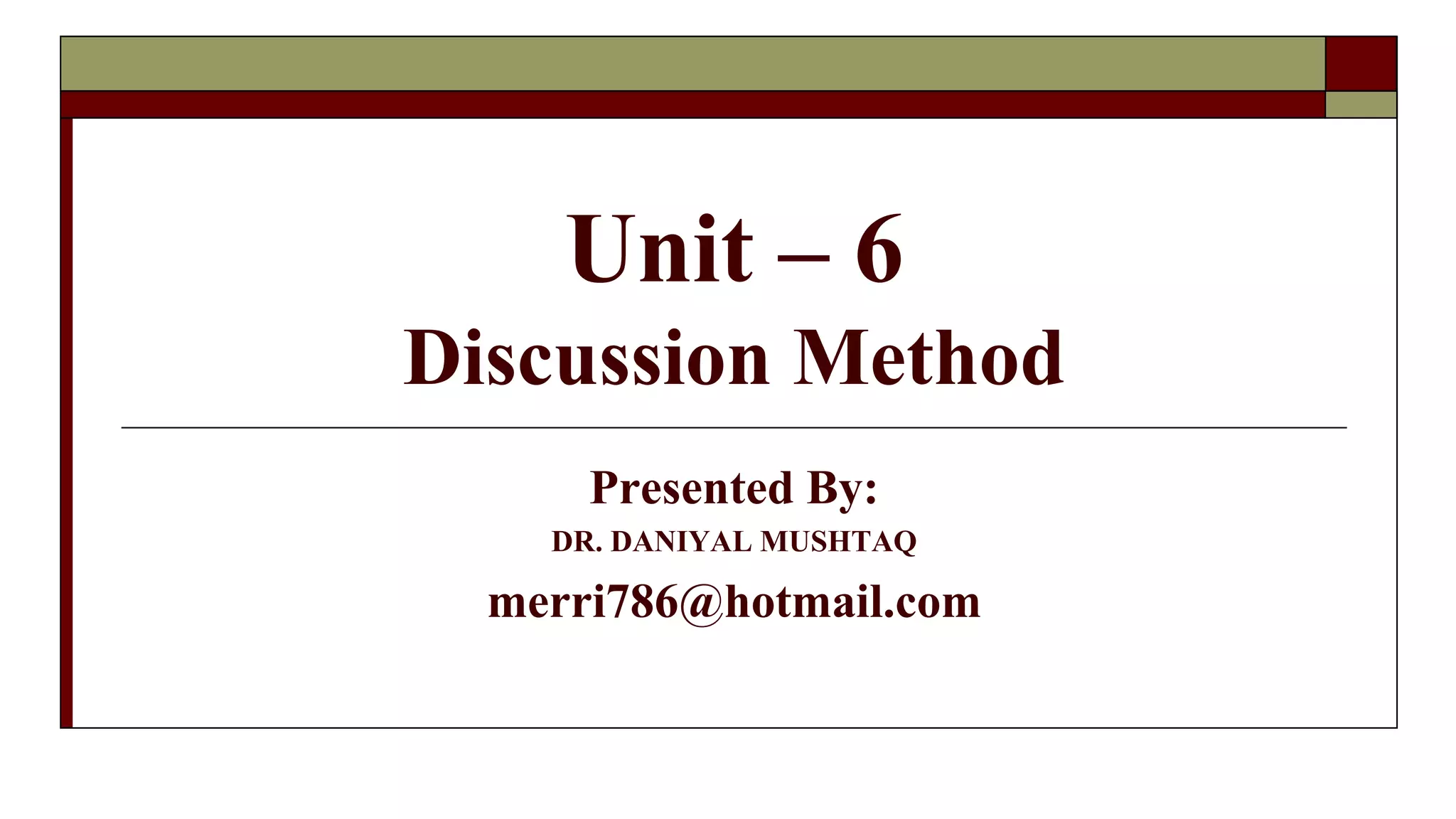 The document discusses the discussion method as an effective teaching strategy that fosters critical thinking, student participation, and community learning through various structured approaches in classrooms. It outlines the planning principles and types of discussions, such as think-pair-share and guided discussions, emphasizing the importance of engaging students' thinking and collaboration. The discussion method has advantages like increased student interest and permanent learning, but also poses challenges like the need for skilled instructors and time consumption.