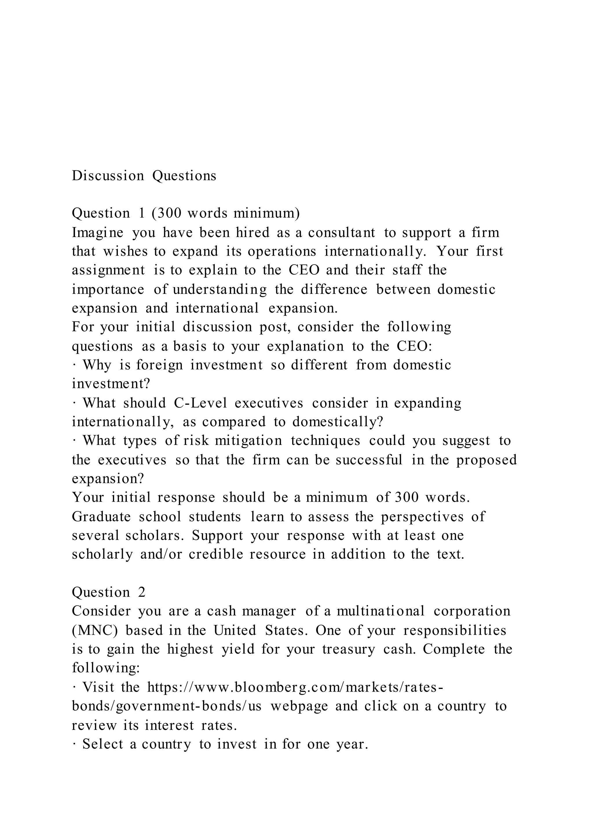 The document discusses a two-part assignment for graduate students focused on international business expansion and cash management in multinational corporations. It emphasizes the importance of understanding the distinctions between domestic and international expansion, considering investment risks, and employing mitigation strategies. Additionally, it instructs students to analyze interest rates in foreign markets for optimal treasury cash management, requiring supportive scholarly resources for their discussions.